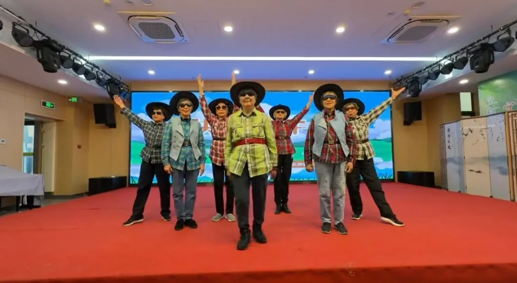 视频里的她头戴牛仔帽,腰围一条红色皮带,一身牛仔装束利落大方。身后的队伍年龄从80岁到90岁不等,每个人都挺直腰板,笑容灿烂。