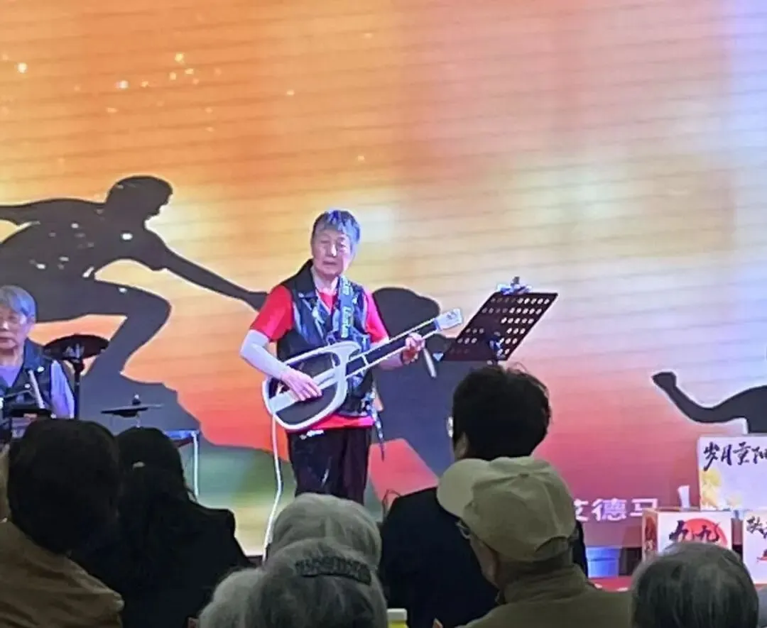 模特队之外,金奶奶还会拿起她的电子吉他弹唱几曲,和乐队一起演出的时光总让她记忆深刻。