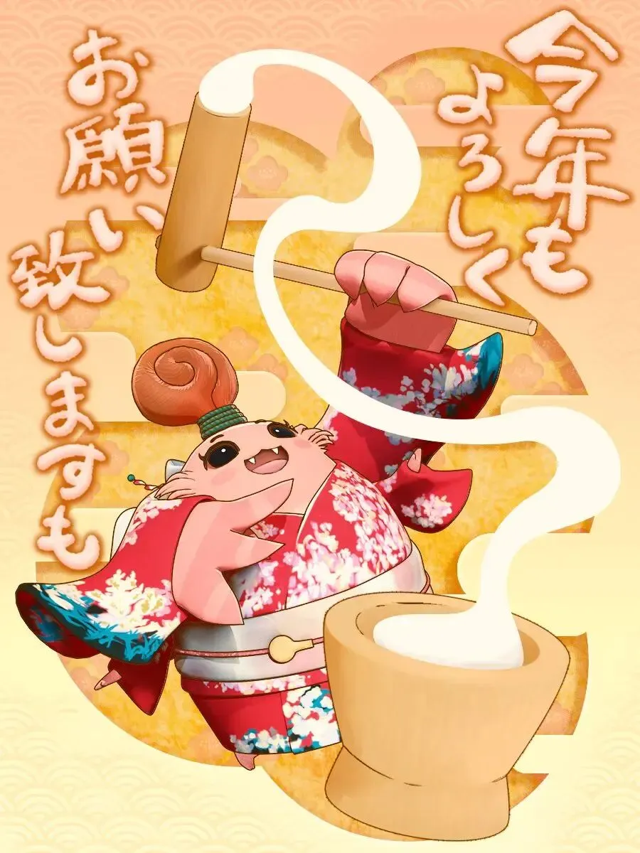 在配文中,官方写道:“Monolith Soft今天正式开工。2026年也请多多关照!大家新年都吃了什么呢?”。这幅充满节日氛围的插图由公司旗下京都工作室的设计师绘制。图中描绘了身着喜庆的和服“力奇”正在捶打年糕的场景。画面细腻温馨,色调柔和。