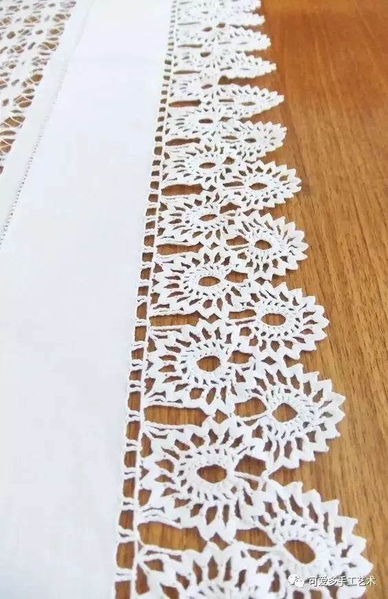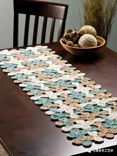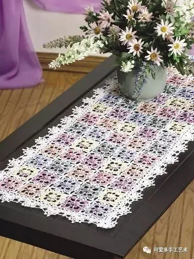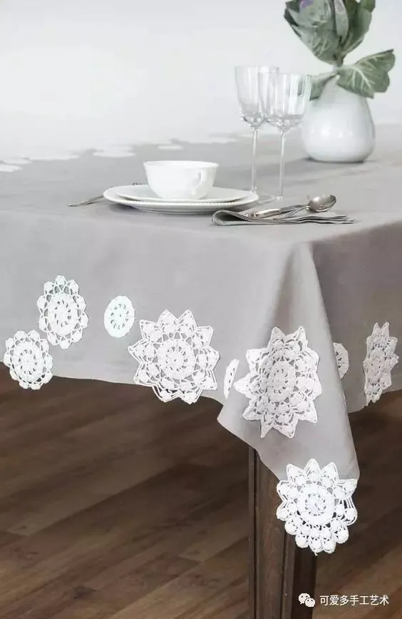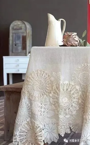 没时间钩太多蕾丝花片 ,那么钩几片与布艺进行结合就成了一块蕾丝桌布啦,而且可以经常洗,使用率大大提高 。