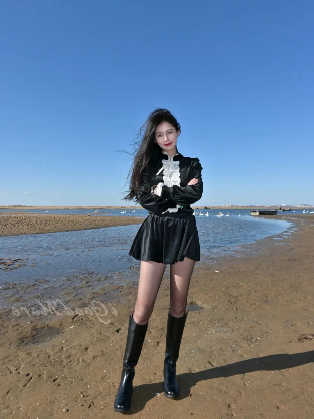 靴子与丝袜的搭配恰到好处地勾勒出腿部曲线,让双腿看起来更加修长纤细。即使在泥泞的滩涂上行走,也能轻松应对,实用性与美观性并存。