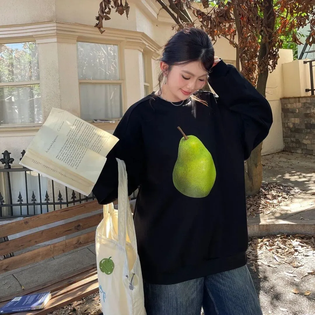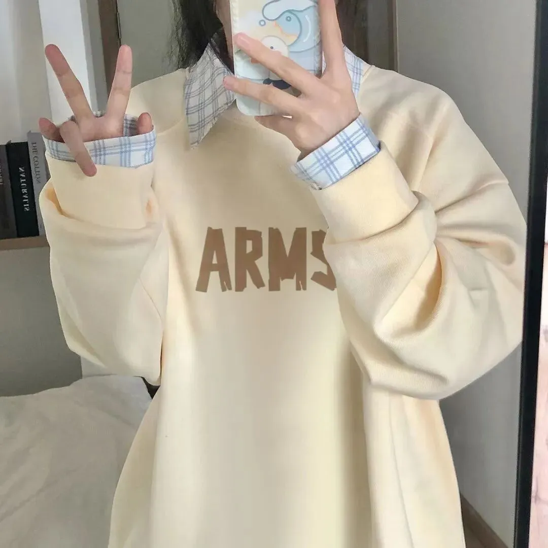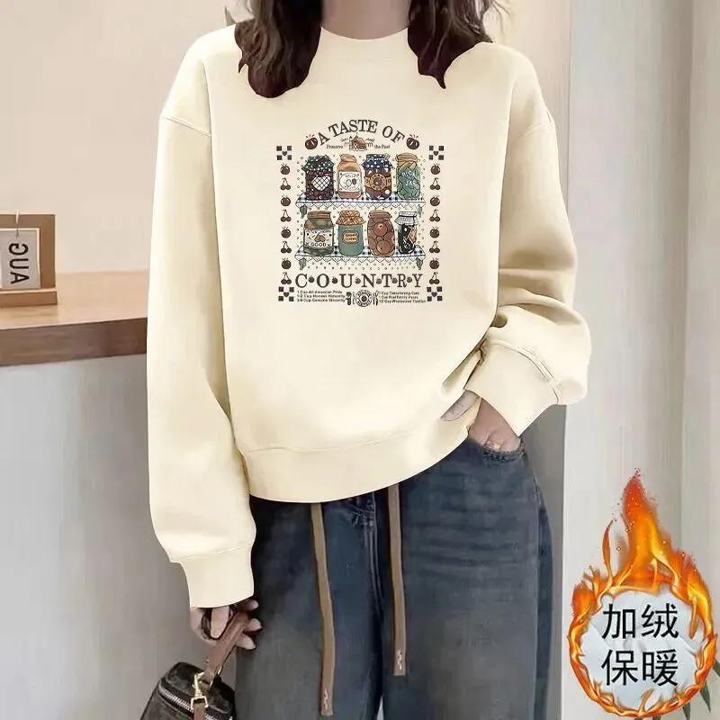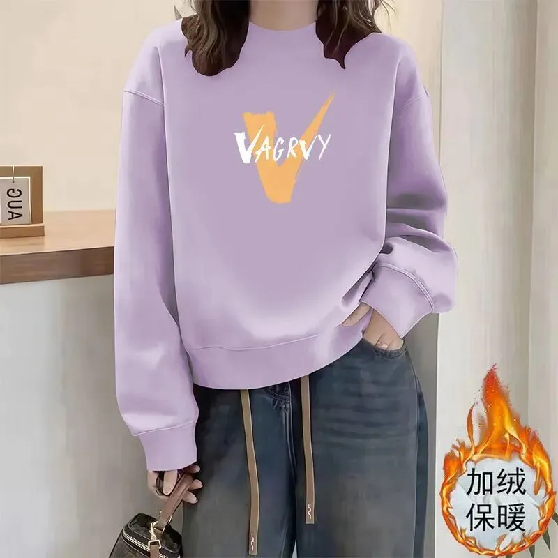 韩版休闲宽松小众设计印花圆领加绒卫衣女百搭休闲宽松时尚慵懒风