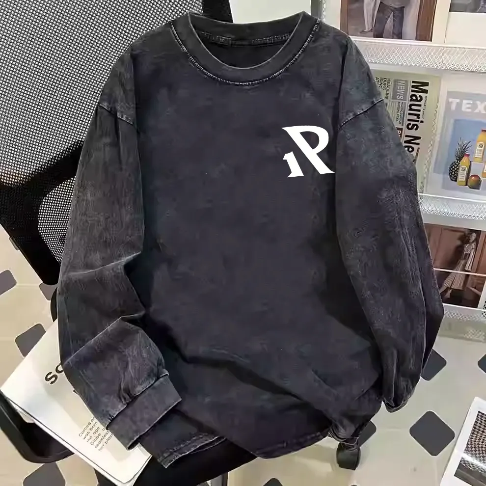 新款黑色水洗宽松纯棉潮牌长袖时尚潮流休闲夏季大码圆领通勤上衣