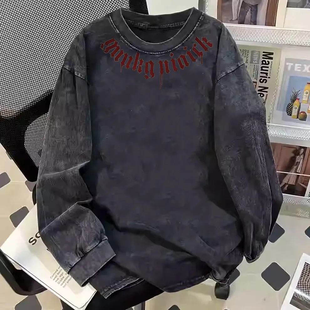 新款水洗打底衫宽松纯棉潮牌长袖时尚潮流休闲夏季大码印花上衣