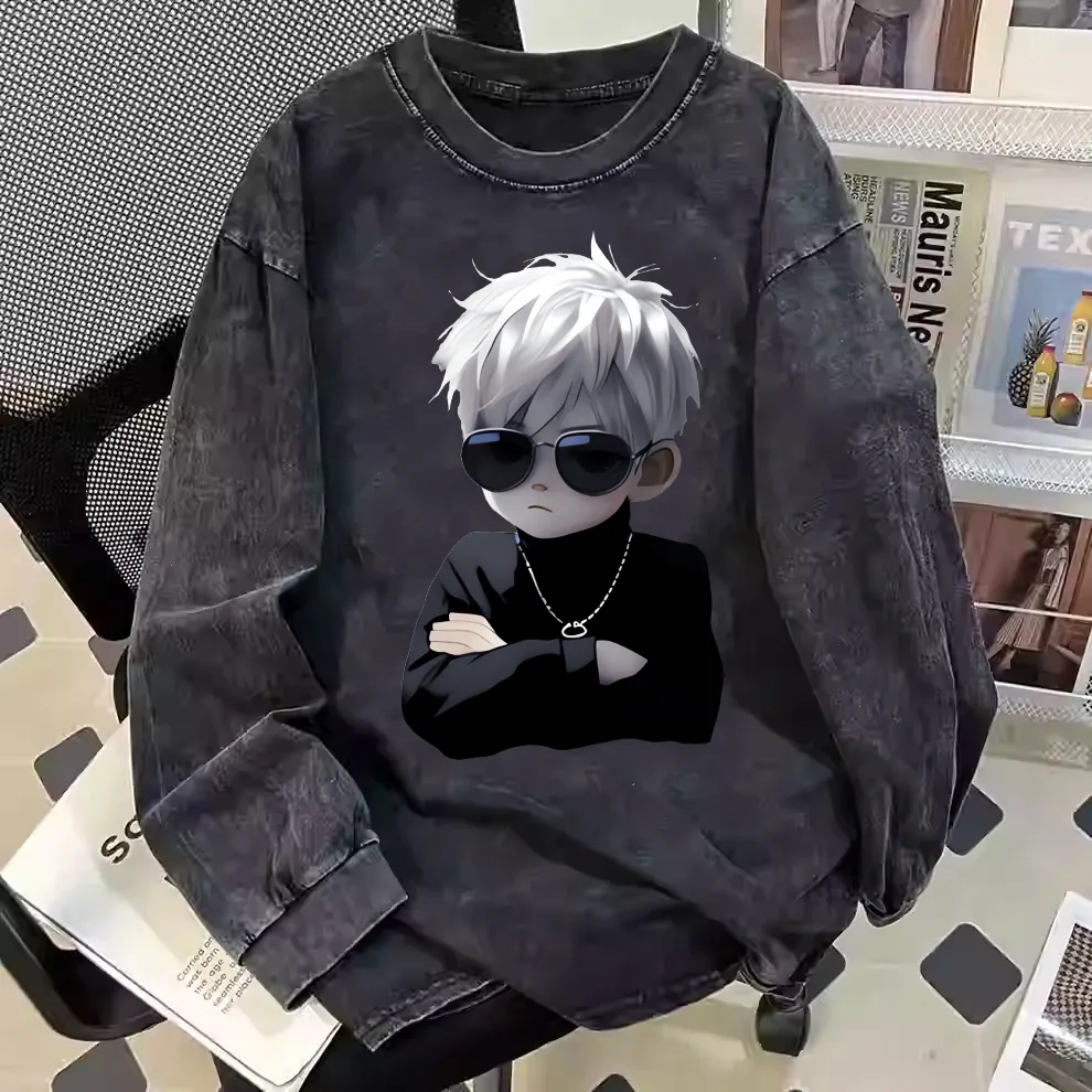 新款百搭大码宽松纯棉学生潮牌长袖时尚潮流休闲ins印花做旧上衣