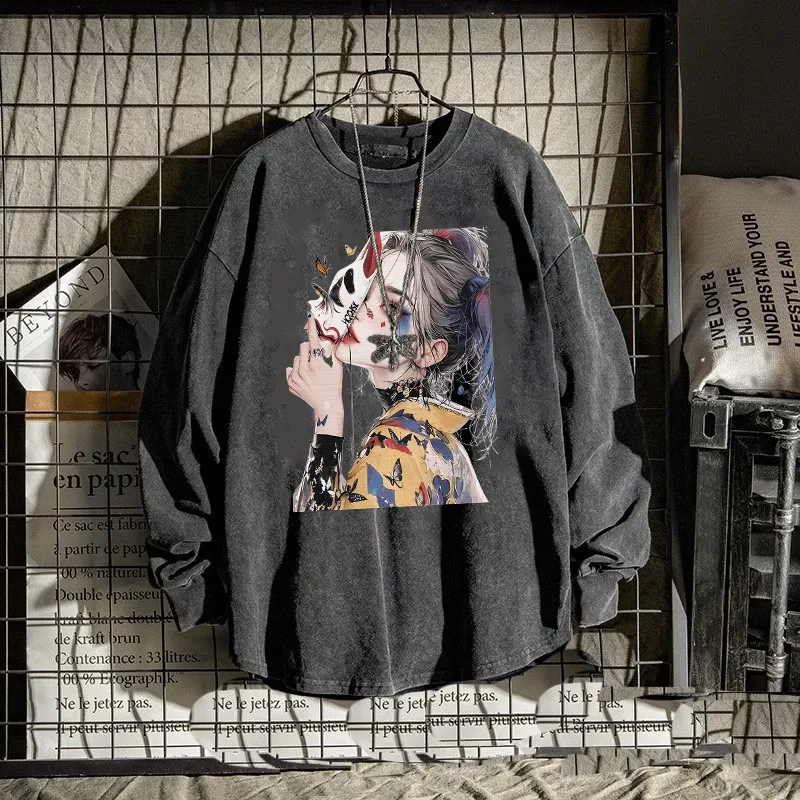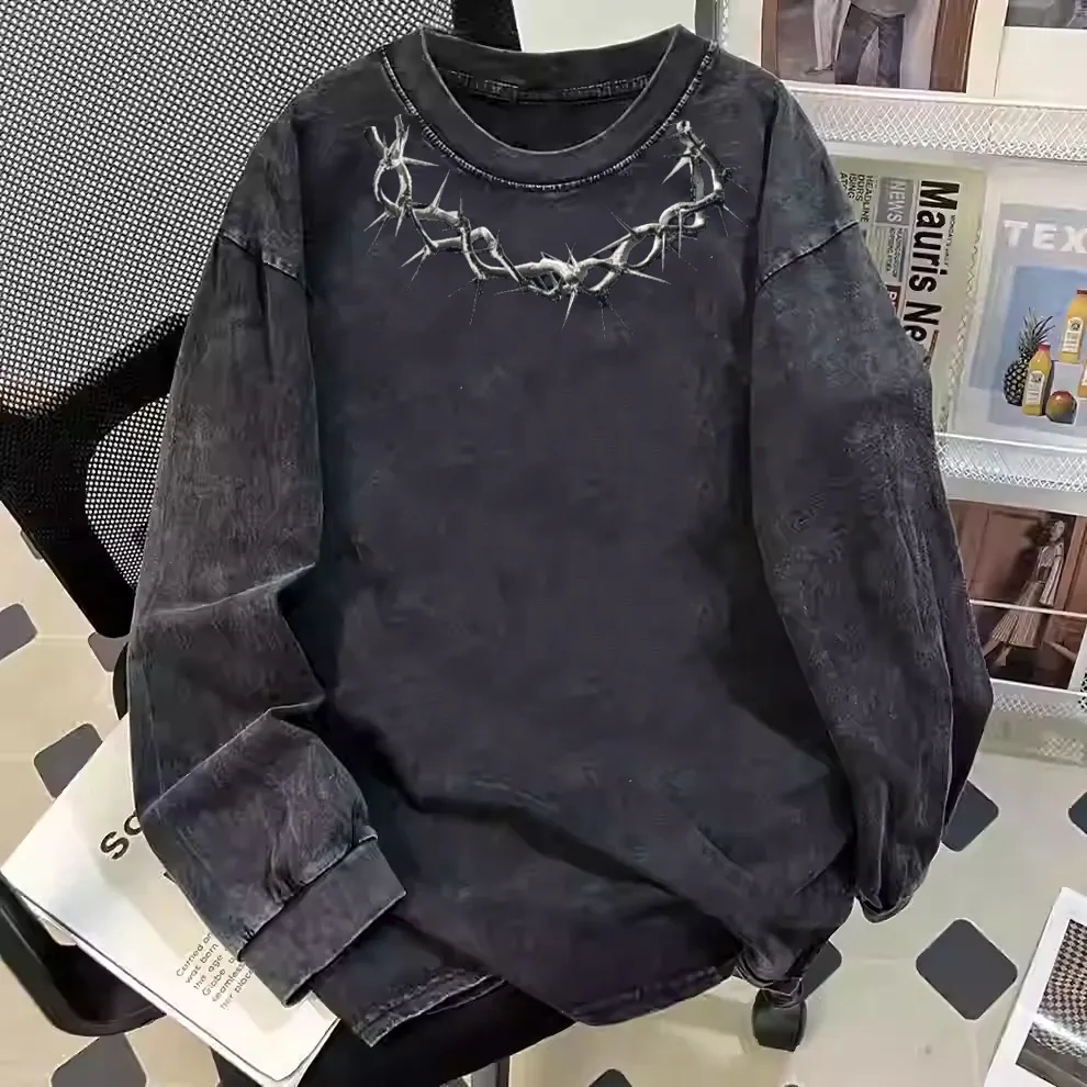 新款印花ins百搭大码休闲水洗秋季复古长袖宽松做旧上衣夏季t恤