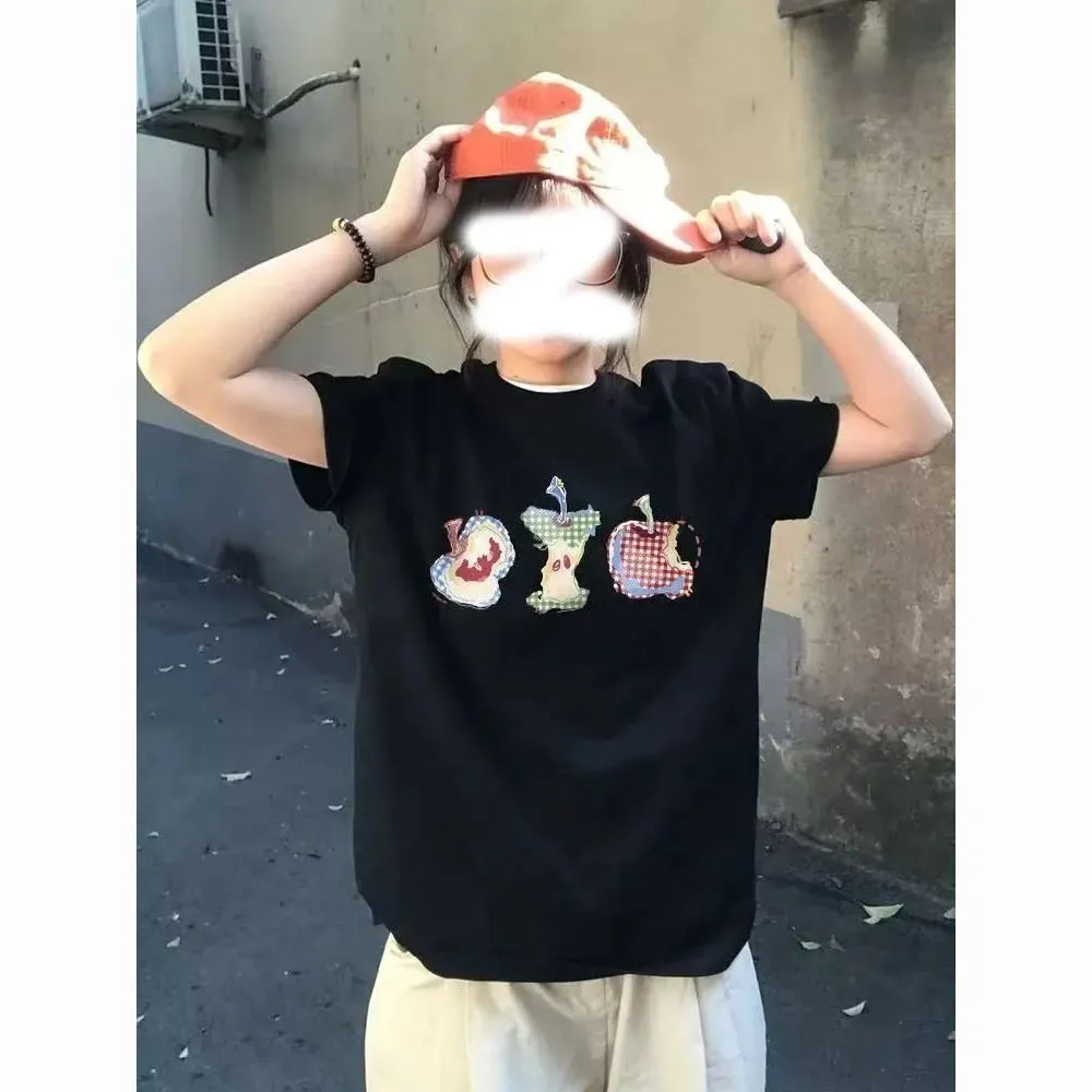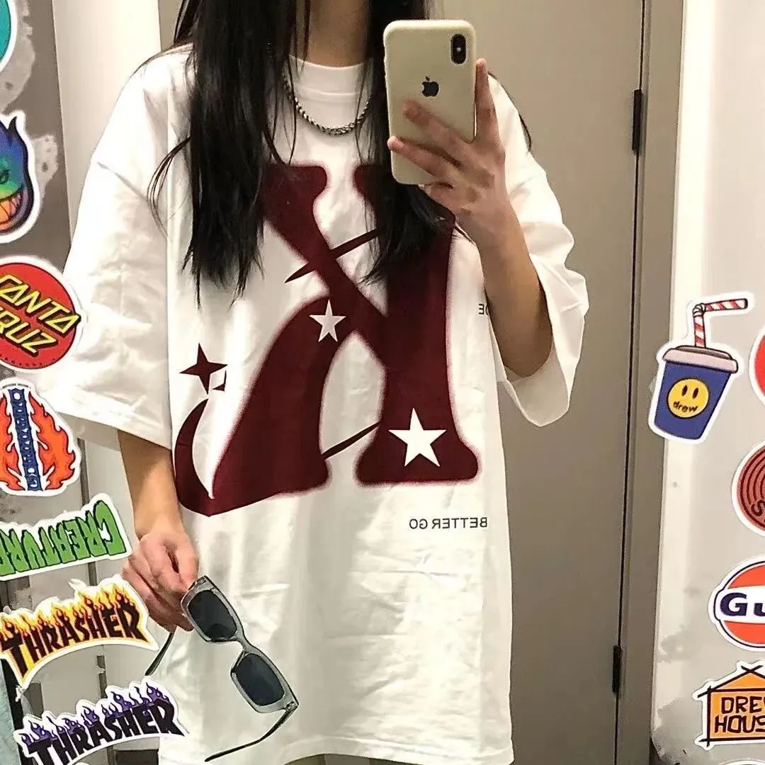 时尚美式复古潮牌棉精梳纯棉2024年夏装中长款短袖T恤女宽松韩版