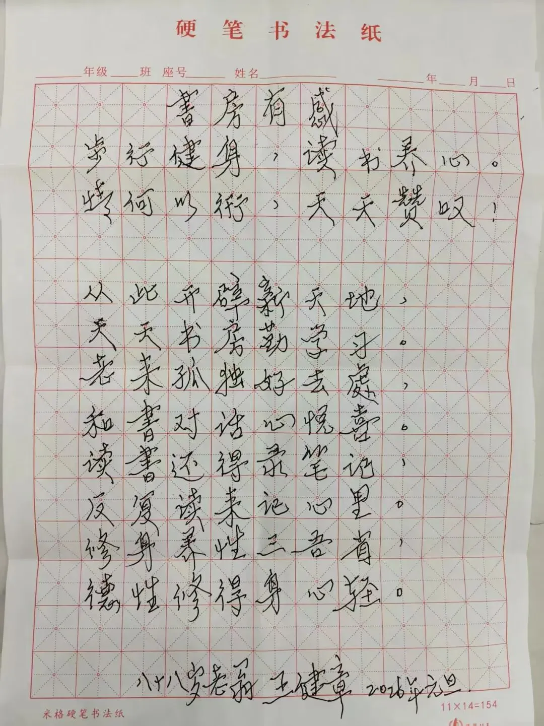 信笺展开,字迹工整有力。王健章在信中写道:“步行健身,读书养心。”“从此开辟新天地,天天书法勤学习。”他表示,自己多年来坚持到馆阅读,在这里感受到宁静与充实、感受如家般的温暖,也对图书馆工作人员的热情服务深表谢意。