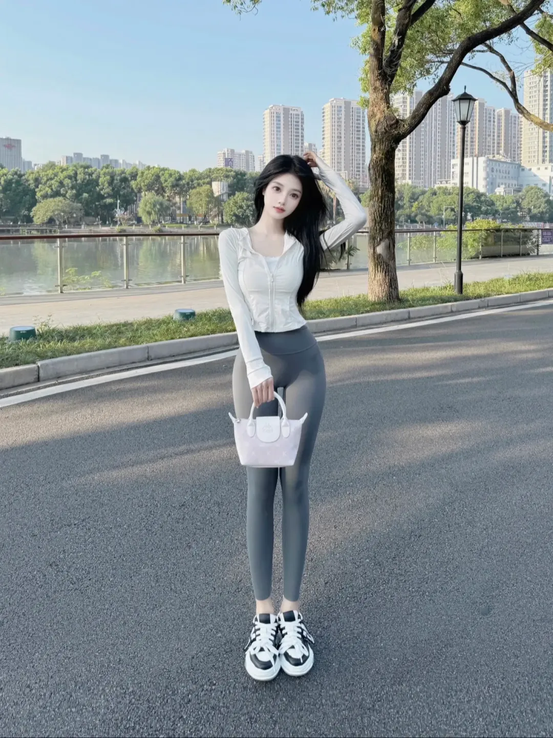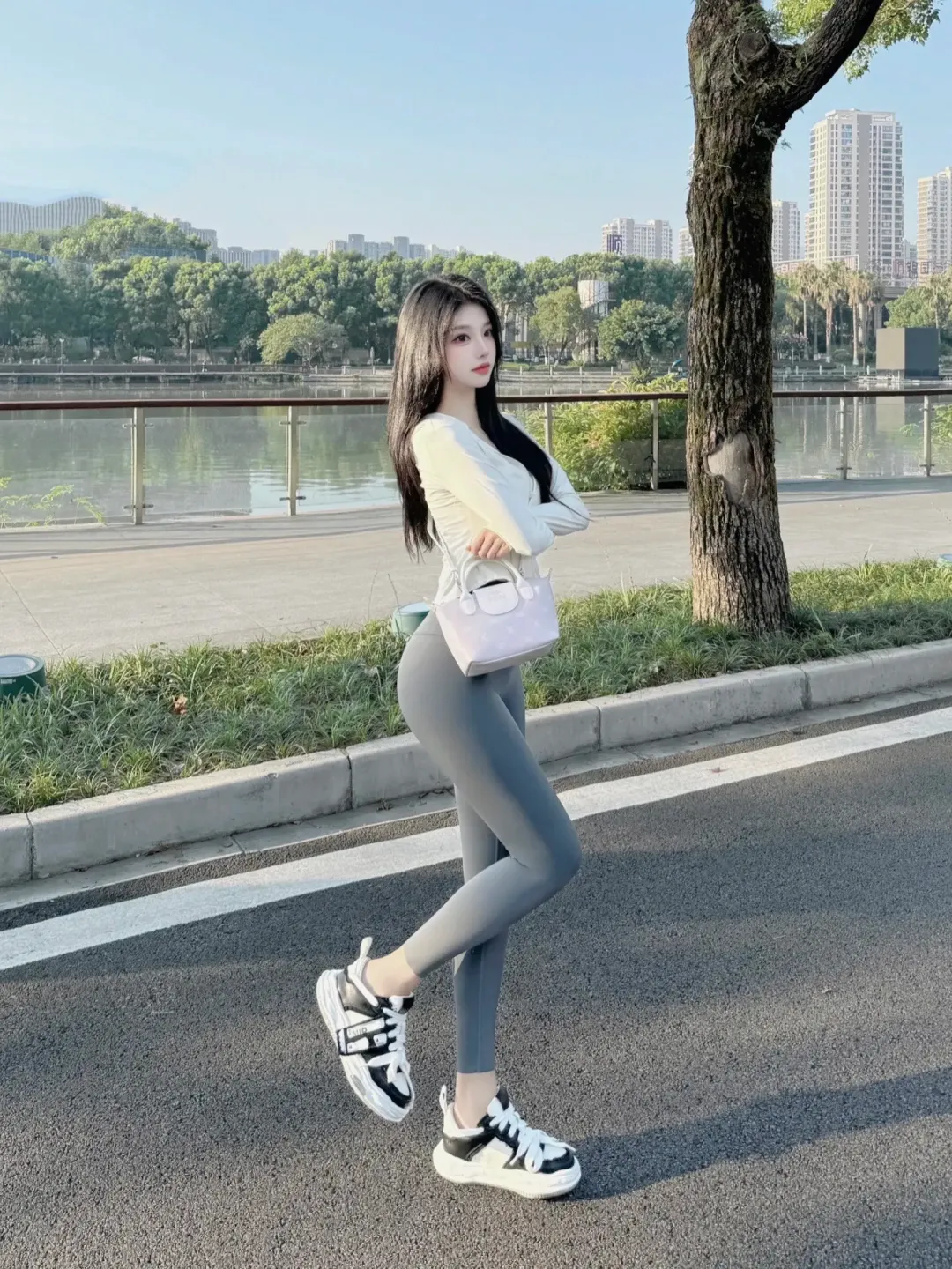 背景里的江水平静得像面镜子,映着远处的高楼和岸边的树,栏杆的金属反光和路面的白标线在画面里织出浅淡的线条,刚好把她框在中间 —— 不是刻意的摆拍,更像路过时被镜头偶然捕捉的瞬间,连空气里的浮尘都带着温柔的颗粒感。