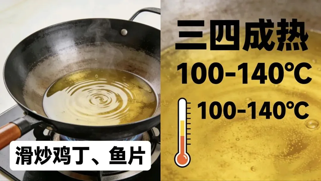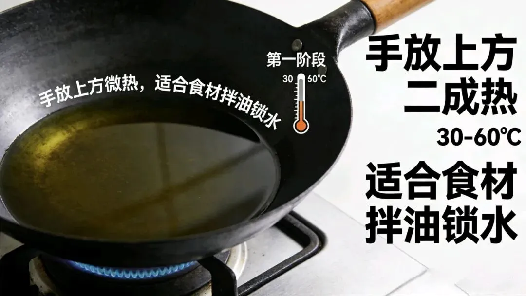 - 一二成热(30-60℃):油面平静,手放上方微热 → 适合食材拌油锁水。