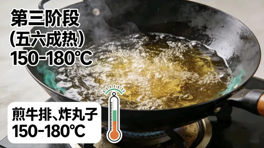 - 五六成热(150-180℃):油面波动明显,青烟升起 → 适合煎牛排、炸丸子。