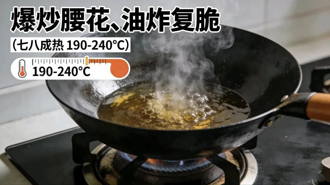 - 七八成热(190-240℃):油烟滚滚,油温极高 → 适合快速爆炒腰花、油炸复脆。