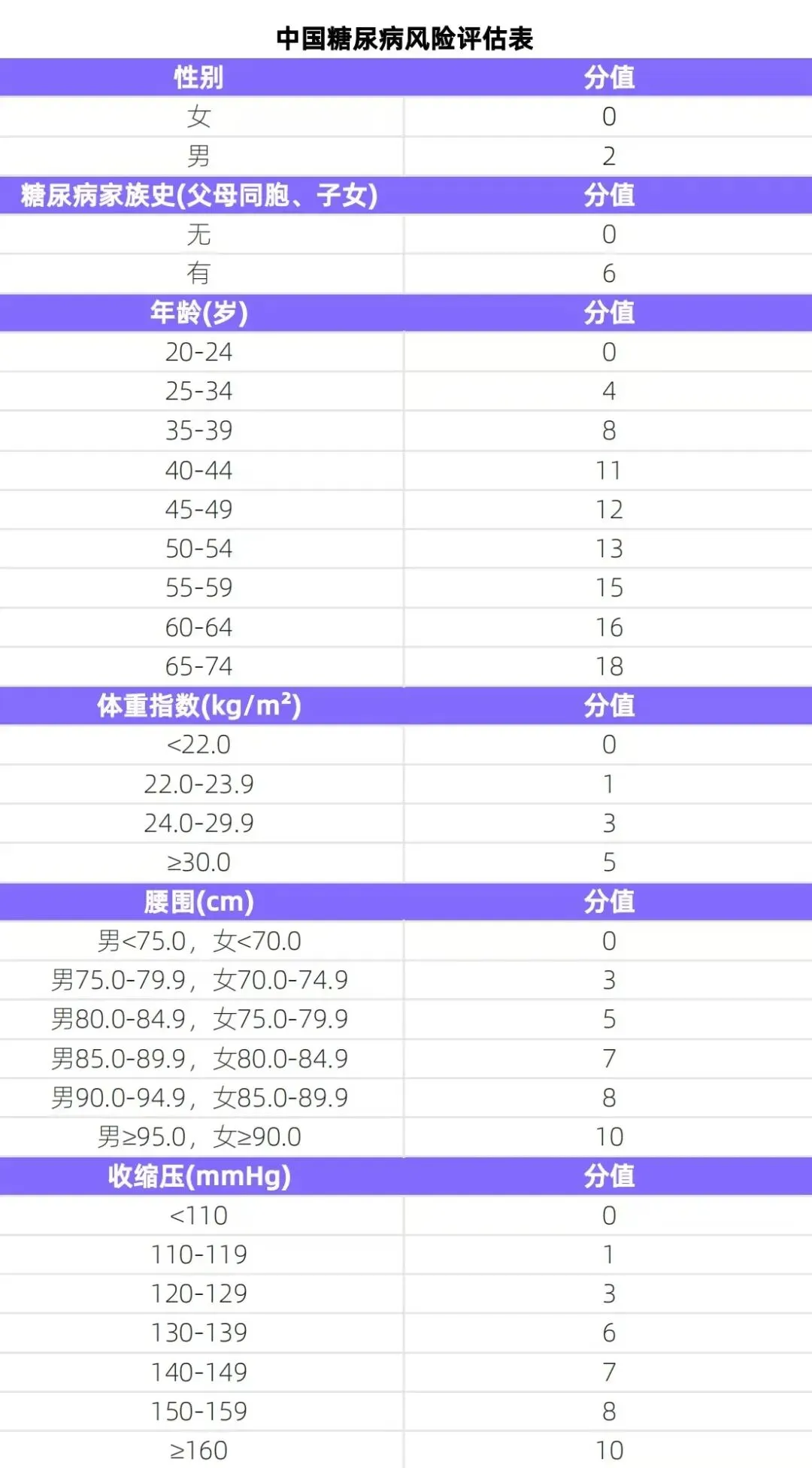 没过35岁的人,也可以参照《中国糖尿病风险评估表》:若你的评分相加≥25分,请重视自己的血糖检测。