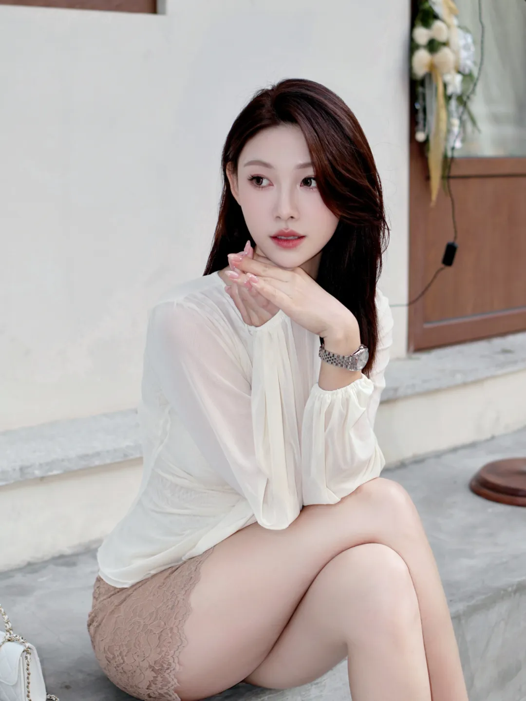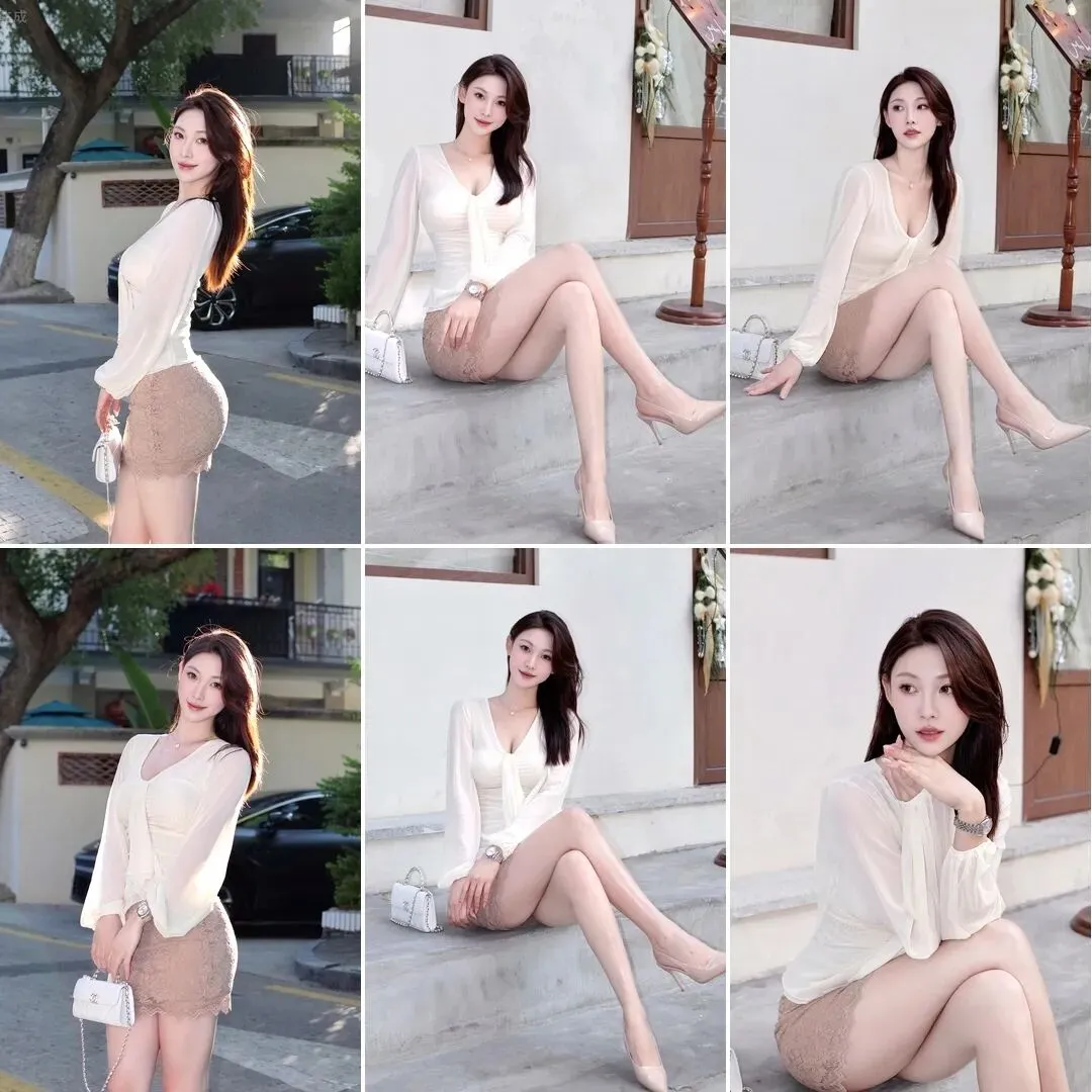 一套白色薄纱长袖上衣,配米色蕾丝短裙和裸色高跟鞋,同一段路边的逆光、门口台阶、白墙旁边来回换站位,动作都很轻。蕾丝短裙街边拍照7个姿势每张都很美!