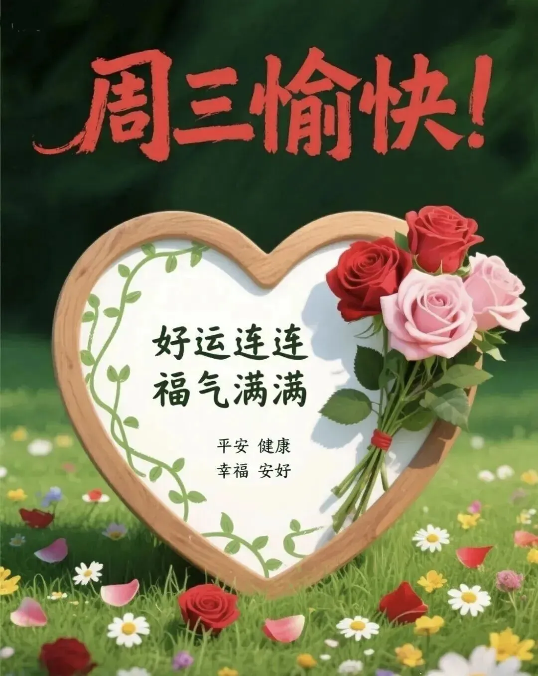 9. 周三清晨送祝福🎈!愿你烦恼清零🧮,快乐加倍,压力下线📴,动力满格🔋,困难绕道走🚫,好运迎面来🍀,工作轻松不费力💼,生活甜蜜好惬意🥗。