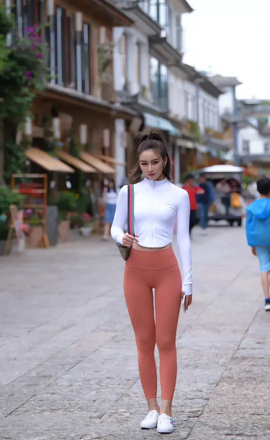 瑜伽裤的弹性优势凸显——可以轻松坐在石栏上、靠在老墙上,捕捉古镇刚苏醒的静谧。
