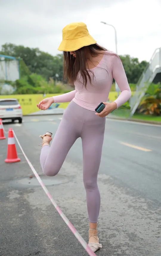 天空是深蓝色,灯笼开始亮起。这时瑜伽裤的深色反而成了优势——它让上半身的粉色更加突出,形成冷暖对比。