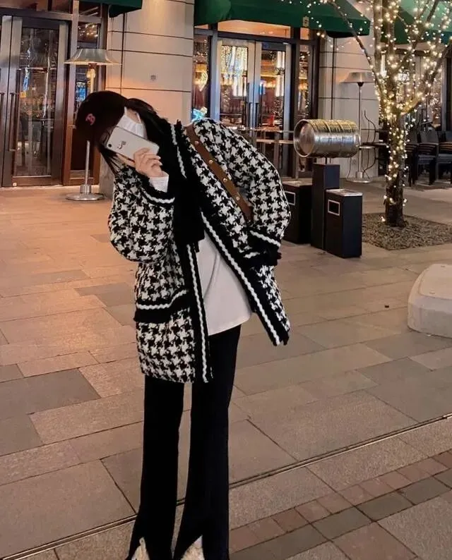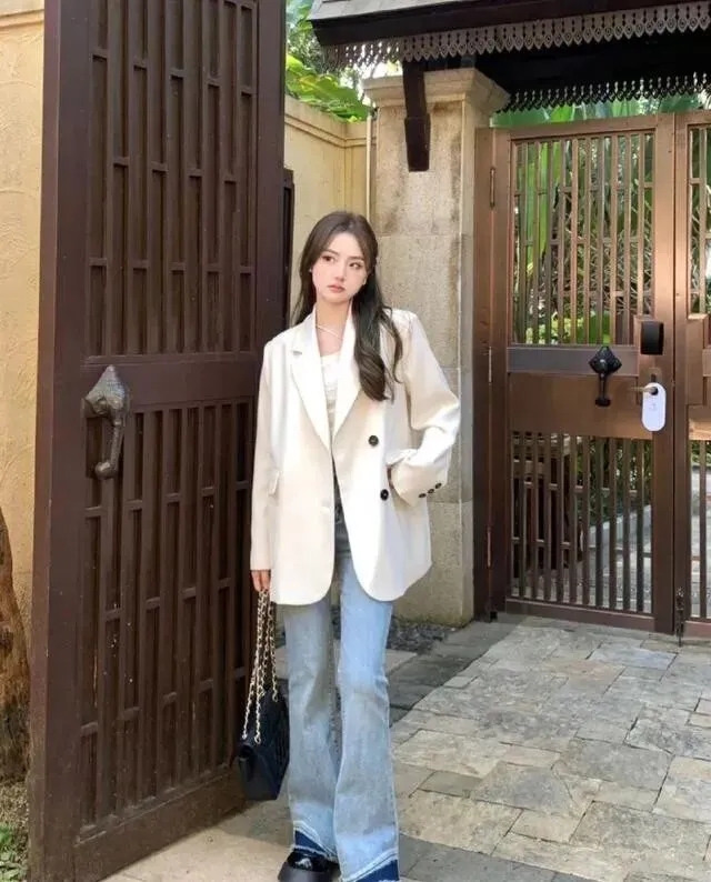 穿马蹄裤的时候 , 上面配个廓形西装 , 上松下紧 , 扬长避短。