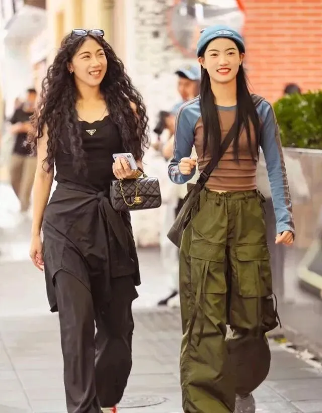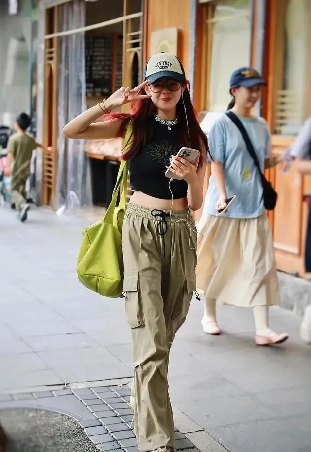 比如工装裤配露脐装 , 风格反差大 , 但辨识度一下就上来了 , 回头率特别高。