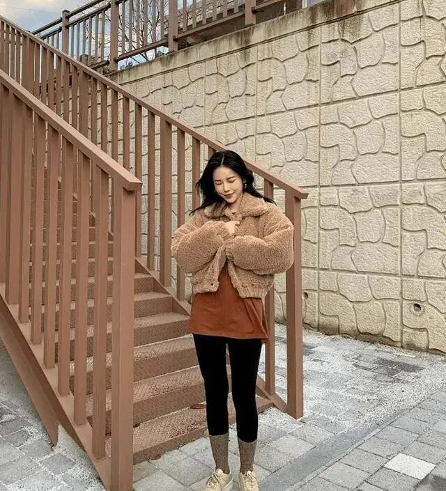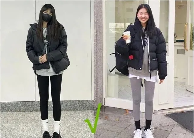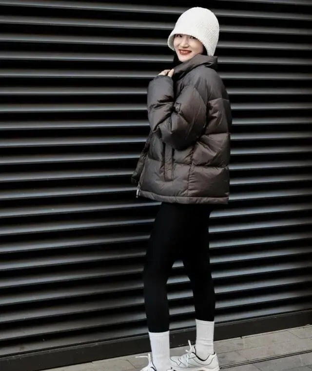 宽松的羽绒服、长款外套 , 遮住臀部的那种 , 和瑜伽裤搭起来既有层次感 , 腿还显细。