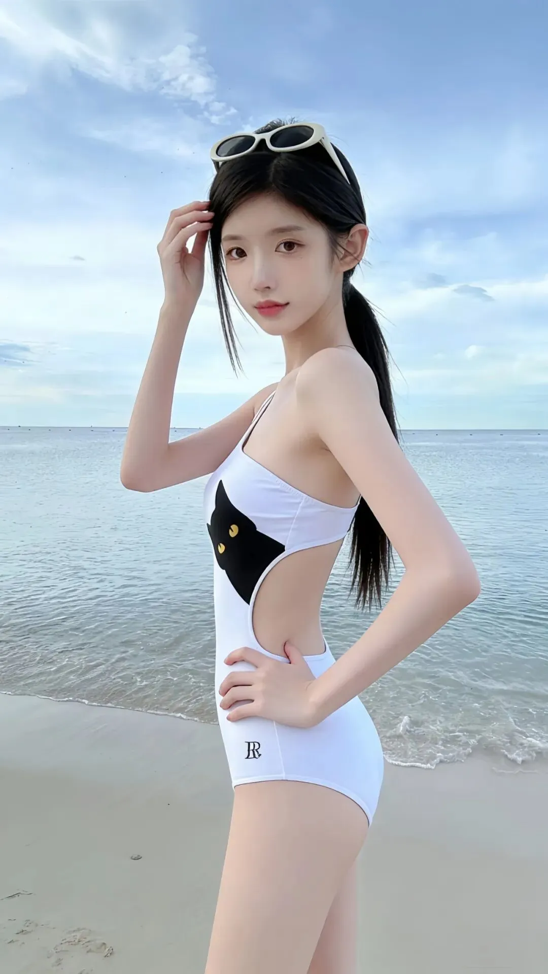 - 服装:在海边散步或休息时,可外搭一件同色系的薄纱开衫,材质轻盈通透,既能起到一定的防晒与遮挡作用,又能增添温柔飘逸的度假感,与泳衣的清新风格相呼应;也可选择一条带有黑色猫爪印花的白色编织腰带,轻轻系在腰间,强调腰线的同时,为造型增加可爱的呼应元素。