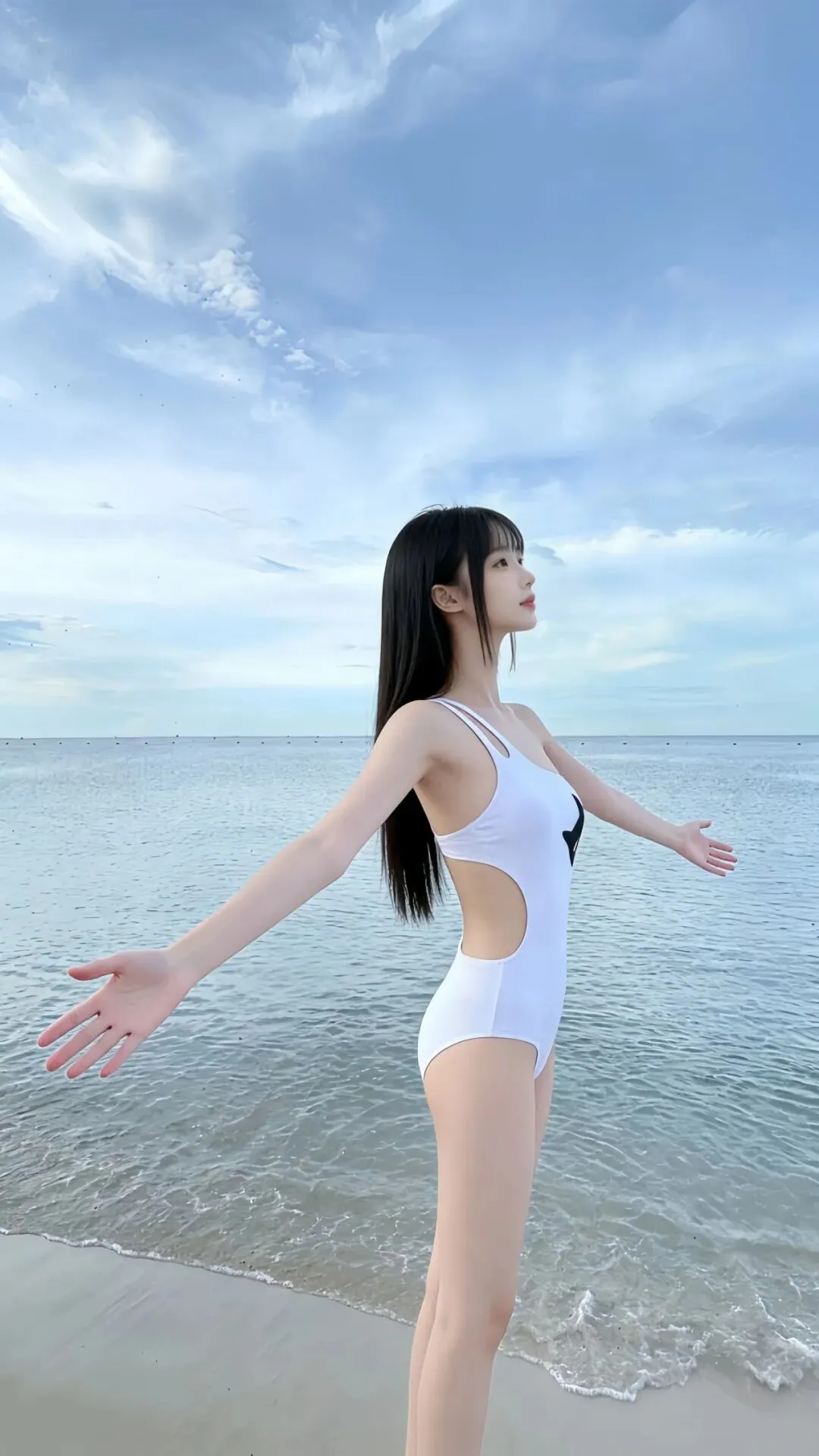 造型效果:整体造型会呈现出俏皮清新又不失精致的海边度假风,既保留了泳衣的可爱甜美感,又通过开衫、配饰等单品增加了温柔飘逸的氛围,适合在海边游泳、拍照或休闲放松。