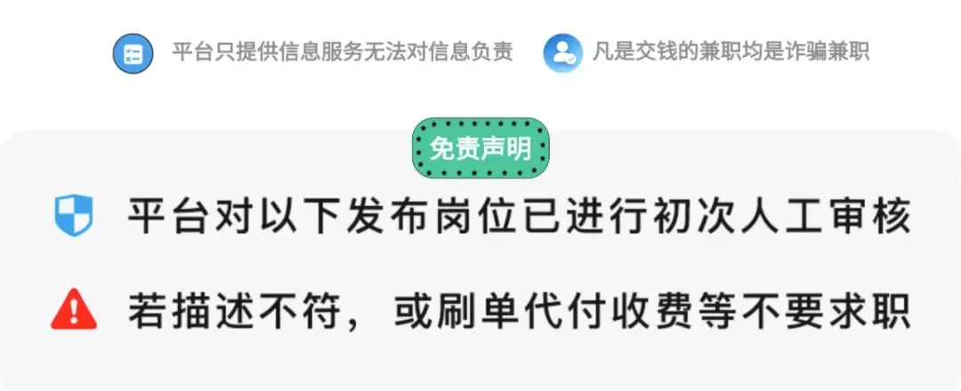 以上所有招聘信息若以各种名义收费,请勿相信、平台仅提供信息发布,不承担任何责任,若有违法违规兼职平台会立即删除相关信息,若因虚假信息导致的损失一律由信息提供者自行承担!平台仅供信息发布展示,不承担任何责任!