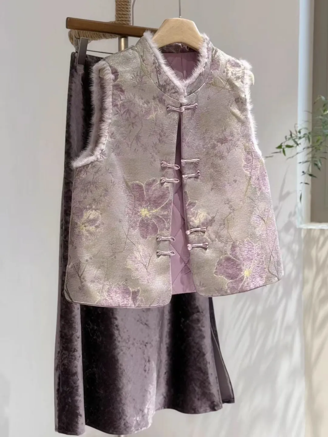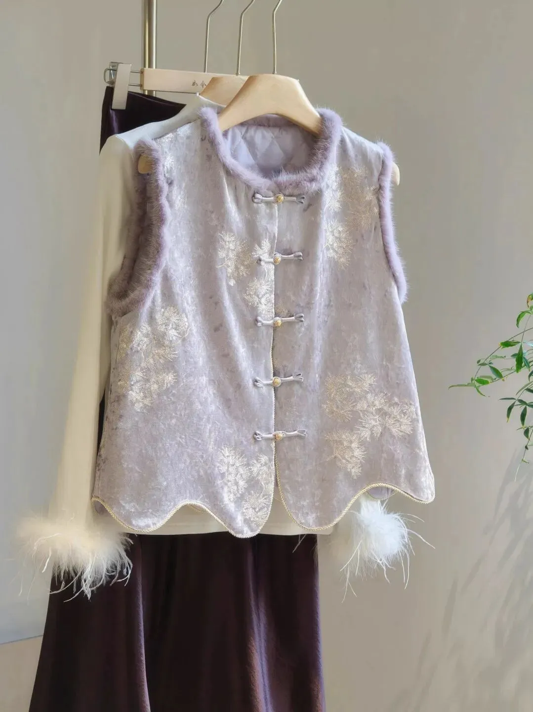 水貂毛还有这种唐装的复杂工艺感,这件灰紫色的织锦马甲很有大家闺秀的气质。