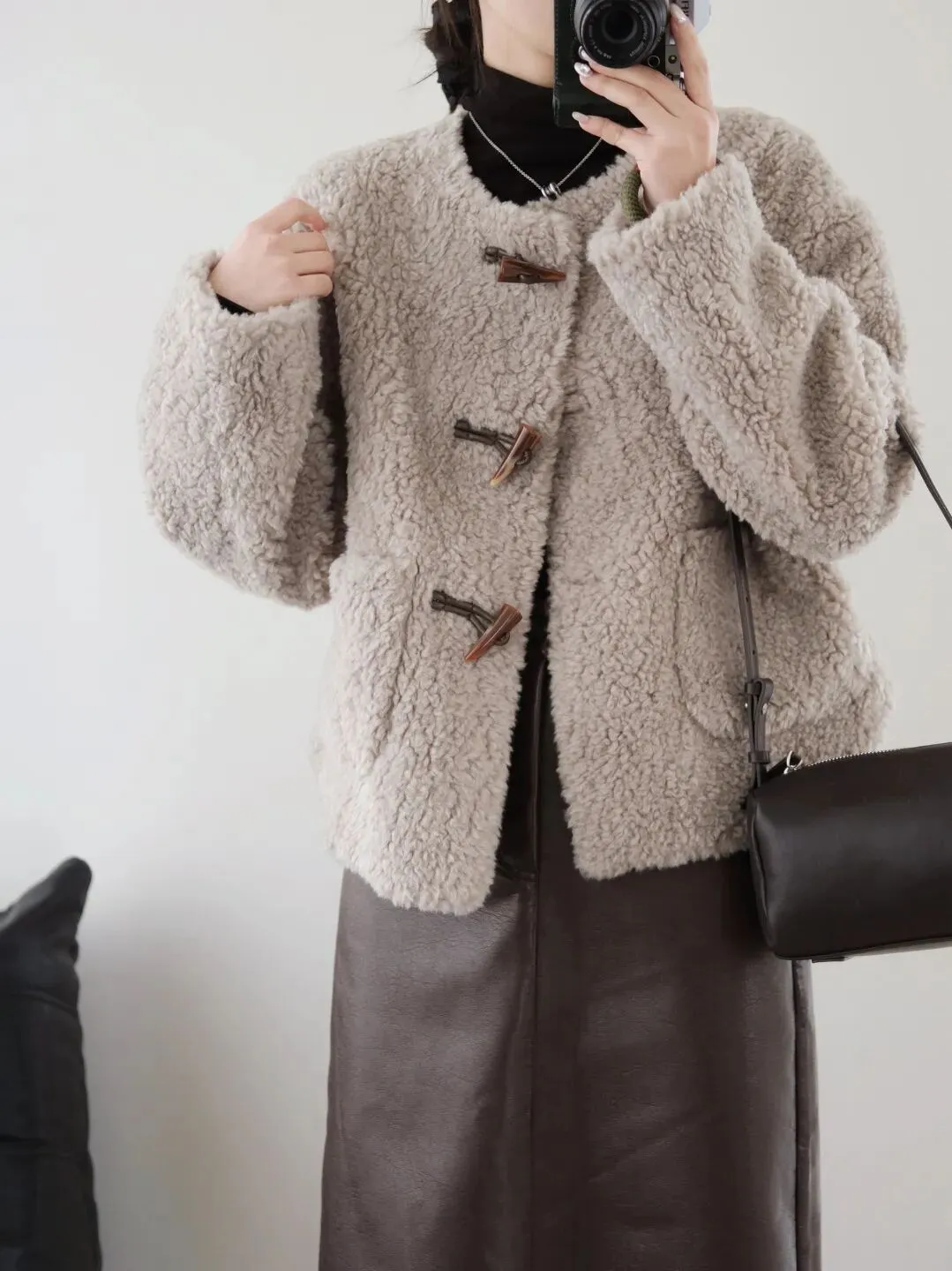 羊羔绒本身自带蓬松感和版型带来的垂坠度,上身一点也不臃肿暖和于无形。
