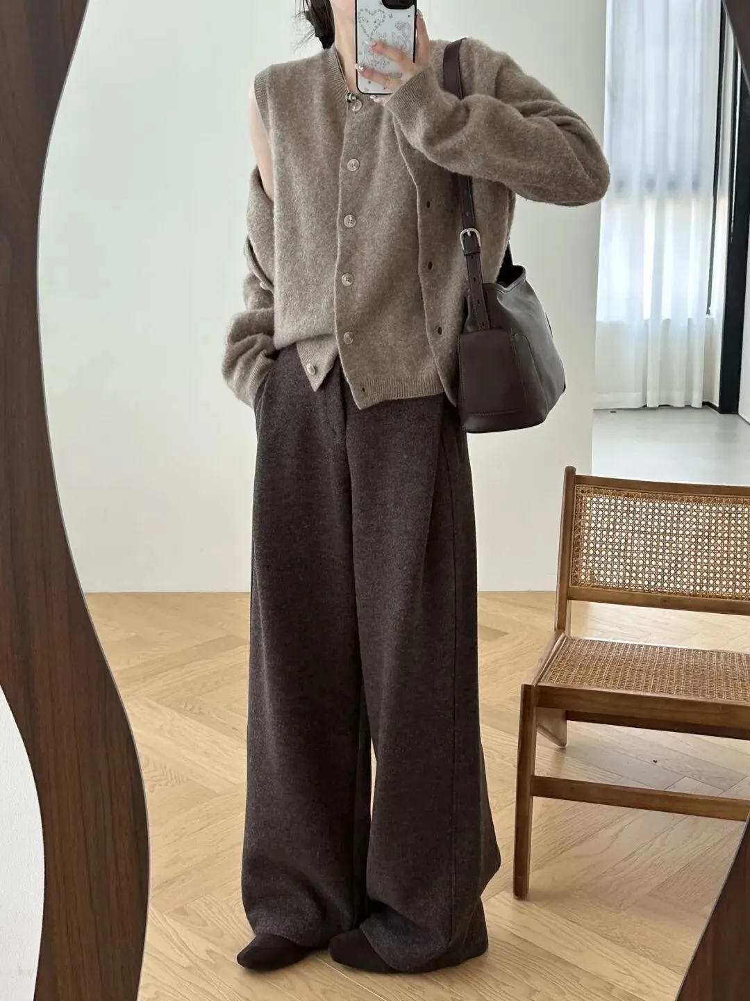 乌木棕和同色系的棕色搭配在一起就很松弛,特别适合去茶馆&咖啡店&图书馆等较安静松弛的地方。