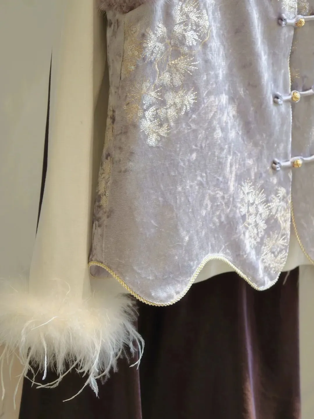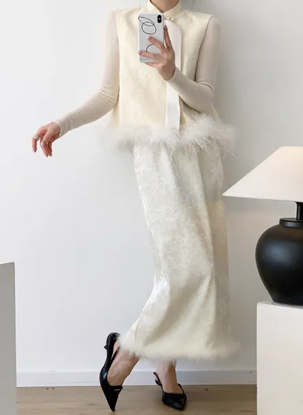 面料也是特殊的肌理感钻石绒不起静电又透气下摆装饰鸵鸟毛和马甲就很适配。