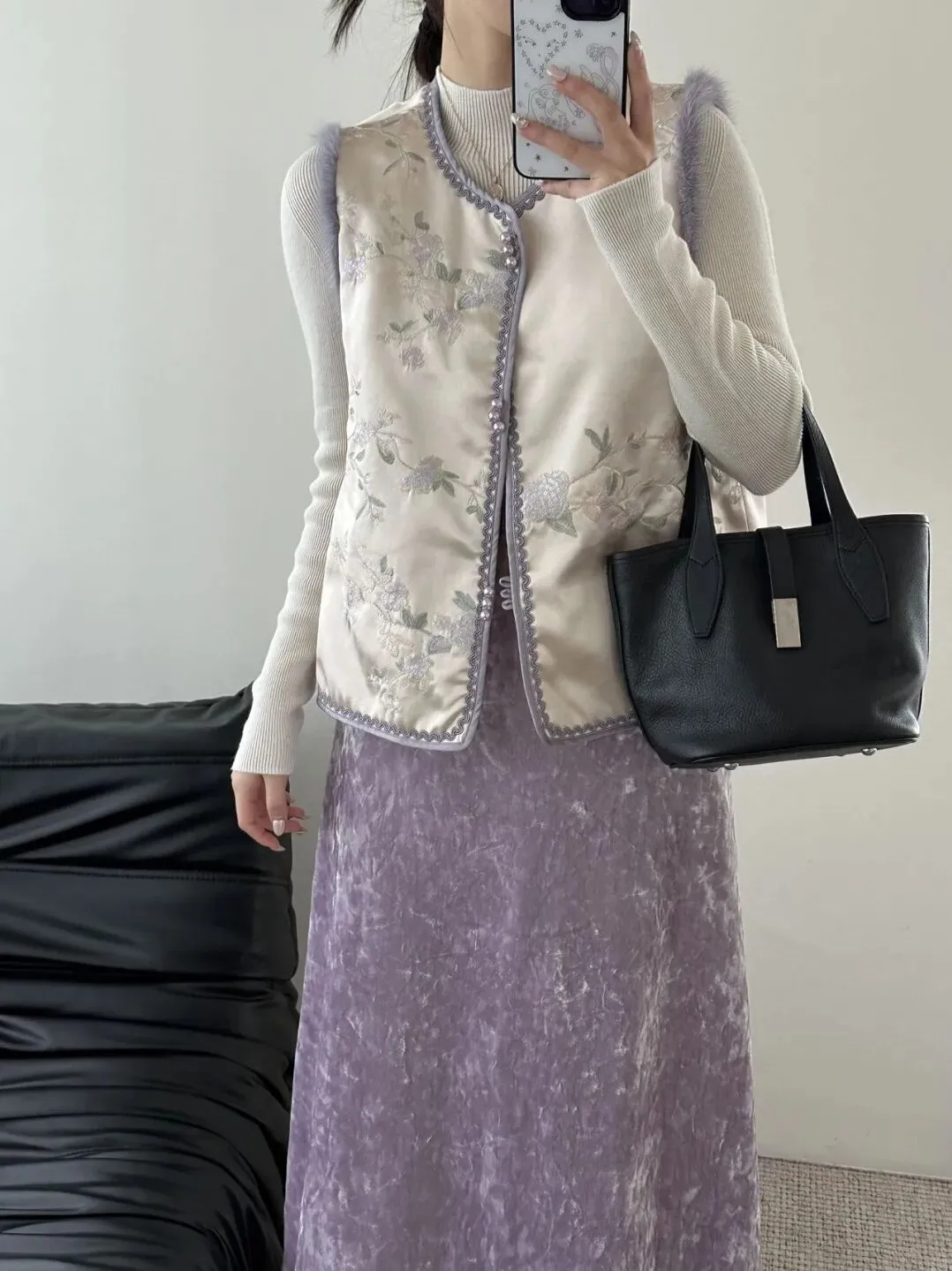 还有这种下摆波浪型的刺绣马甲紫色和米白色都很有贵气感,还有这件紫色和珍珠很适配!