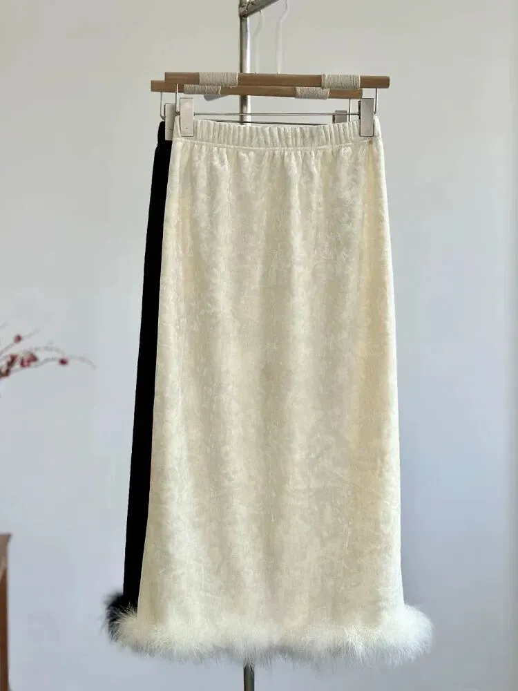 丝绒鸵鸟毛半身裙遮胯显瘦,松紧腰的设计很舒服身材包容度高。