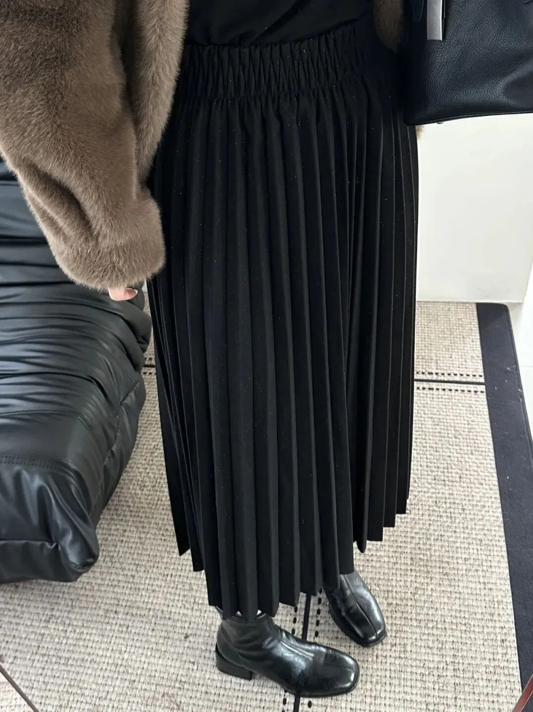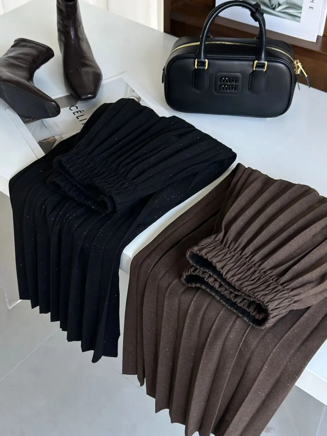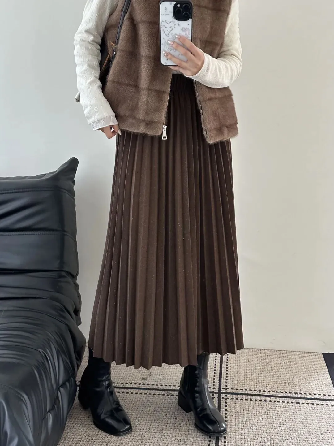除了皮裙,也可以搭配这条百褶裙,穿着更能肆无忌惮。