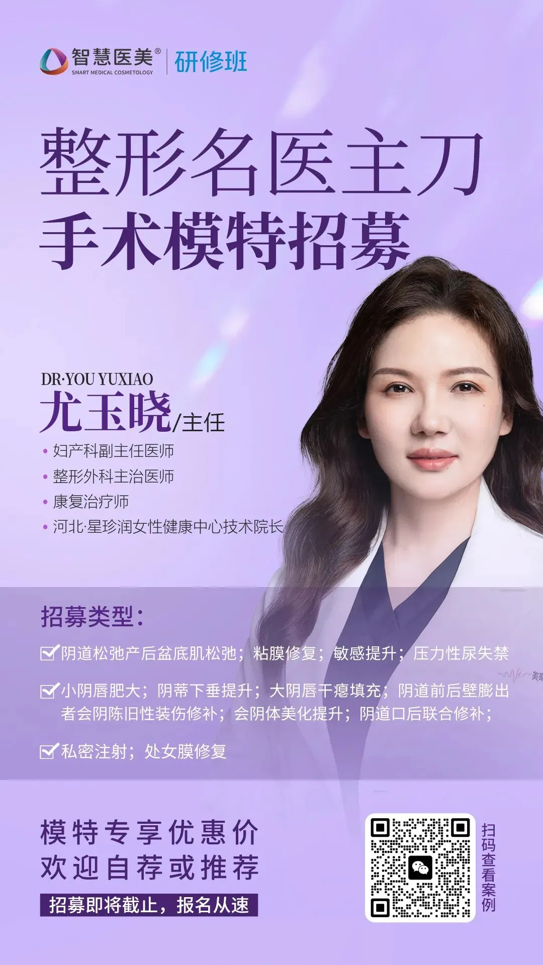 美丽在线  惊喜福利,私密运营与技术研修班模特招募中,国内资深私密整形专家尤玉晓院长亲自操刀,临床经验丰富,手术技术精湛,术后恢复快、体验好,深受行业内外的高度赞誉!