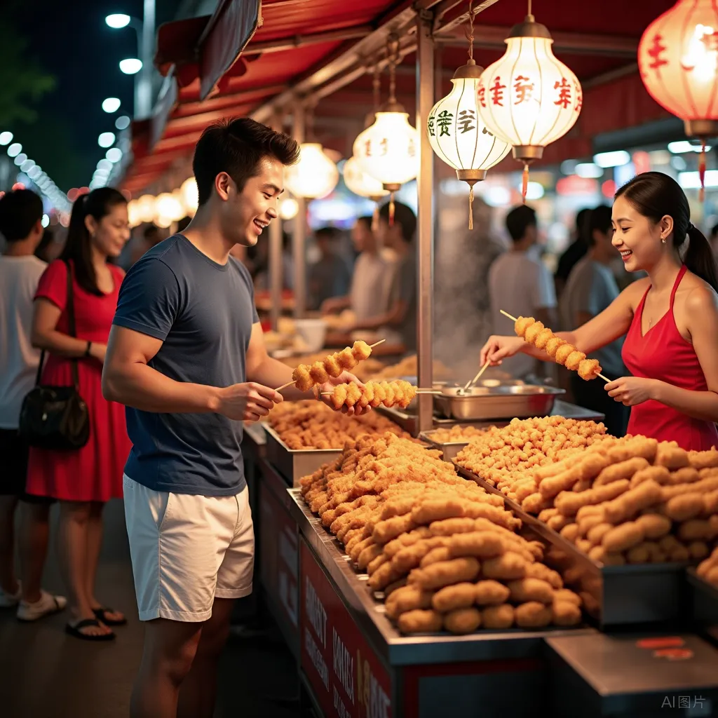 如今,他们是霓虹巷的“炸串侠侣”,靠年糕和淀粉肠,去年流水突破百万。