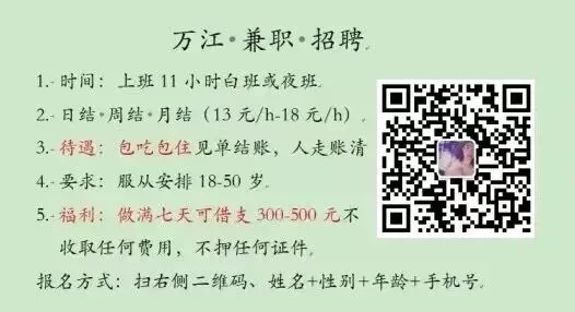 万江-新村亚克力厂日结工(寒假工可报)薪资:13元/小时,下班发工资福利:包吃包接送(需自带碗筷)工作:手工活(长白班坐班)要求:男女不限,16-50岁,看着年轻、视力好也可;日限20名左右,需提前报备时间:8:00-12:00、13:30-17:30、18:00-21:00/22:00;7:20集合出发注意:车间禁止拍照、拍视频,违规后果自负联系:李小姐****9667(微信同号)注:要住宿的带行李过来,公司提供宿舍10元/晚