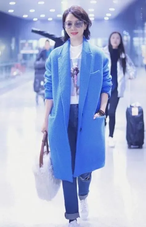 一件大衣打底 , 里面配短袖加牛仔裤 , 减龄又随性 , 同色系搭配还显白 , 气质这块拿捏得死死的。