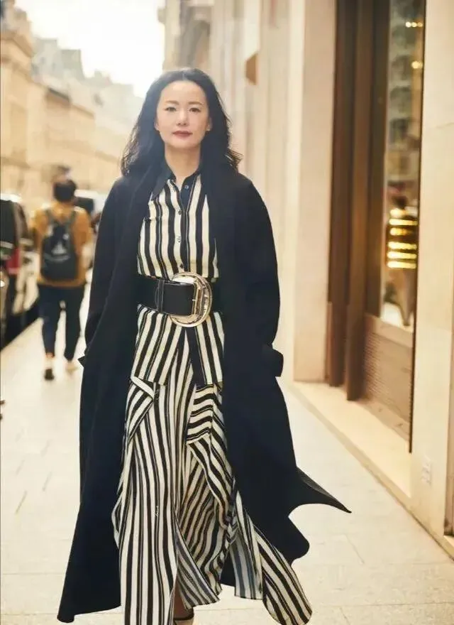 这是最安全的组合了 , 内搭竖条纹长裙 , 腰间来条腰带 , 外面套个大衣 , 经典又有看点 , 怎么穿都不会翻车。
