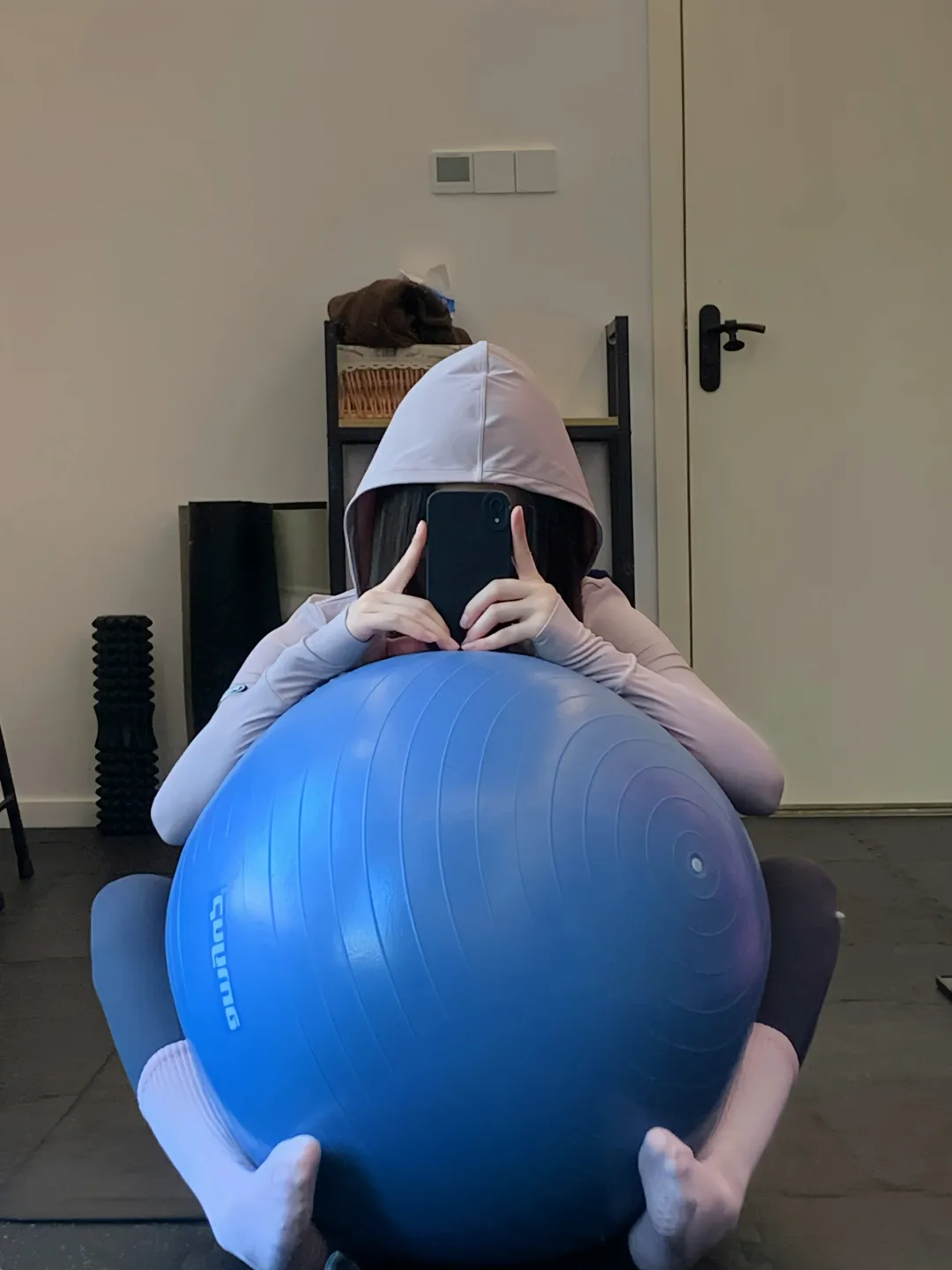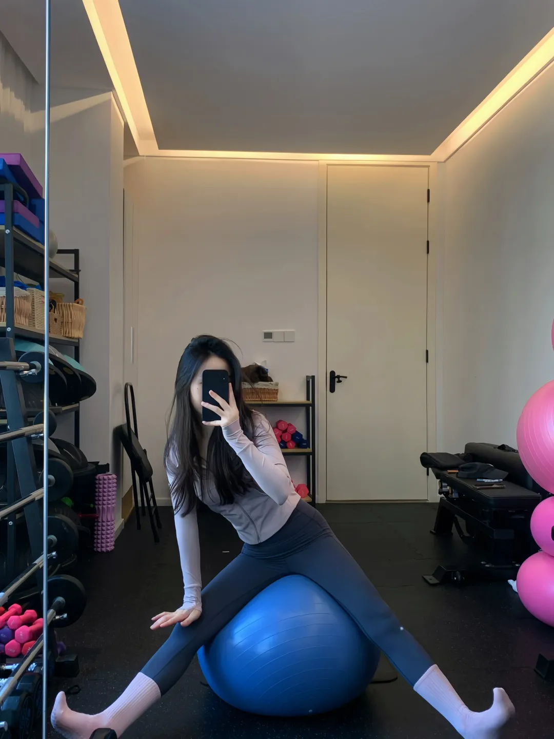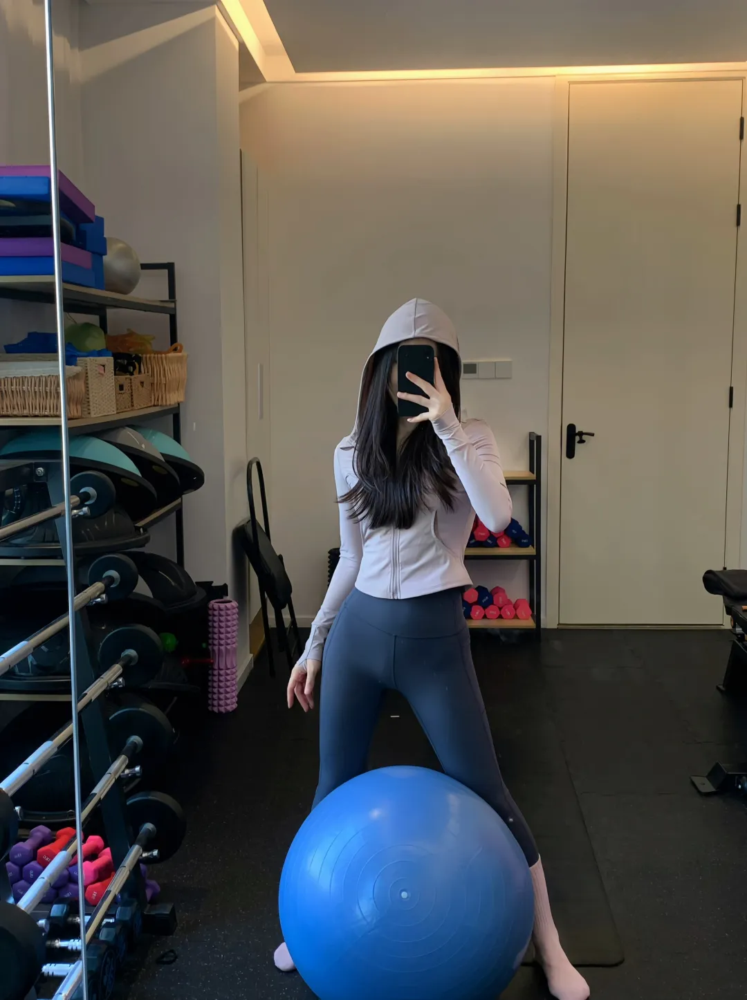 她站在室内健身区,浅灰连帽外套拉合着拉链,帽檐轻轻罩住头顶,右手举着黑色手机对准镜面自拍,左手自然垂在身侧。深灰瑜伽裤贴合着身形线条,粉色的袜子包裹着脚踝,脚下的蓝色瑜伽球圆润饱满,成为画面里亮眼的点缀。长发从帽檐下披散而出,柔软的发丝与外套的利落感形成温柔对比。