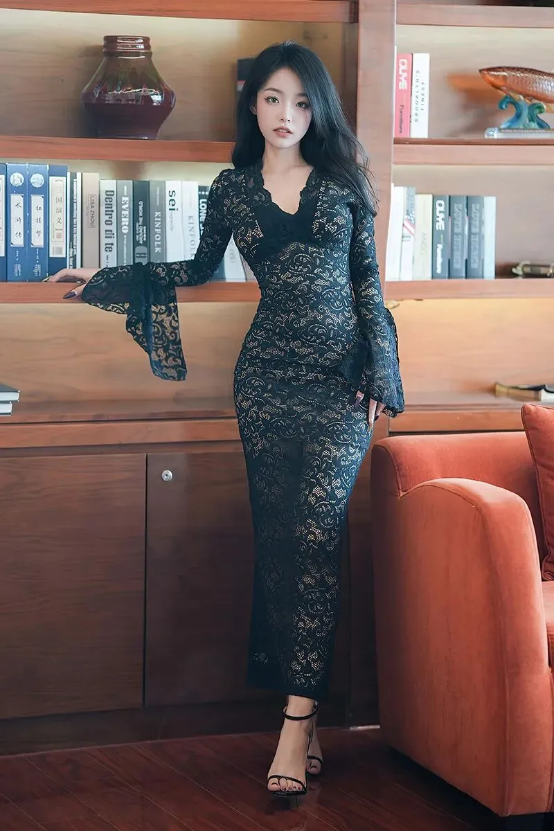 当前位置:首页>美女资讯>白琮瑗性感黑色蕾丝长裙穿搭