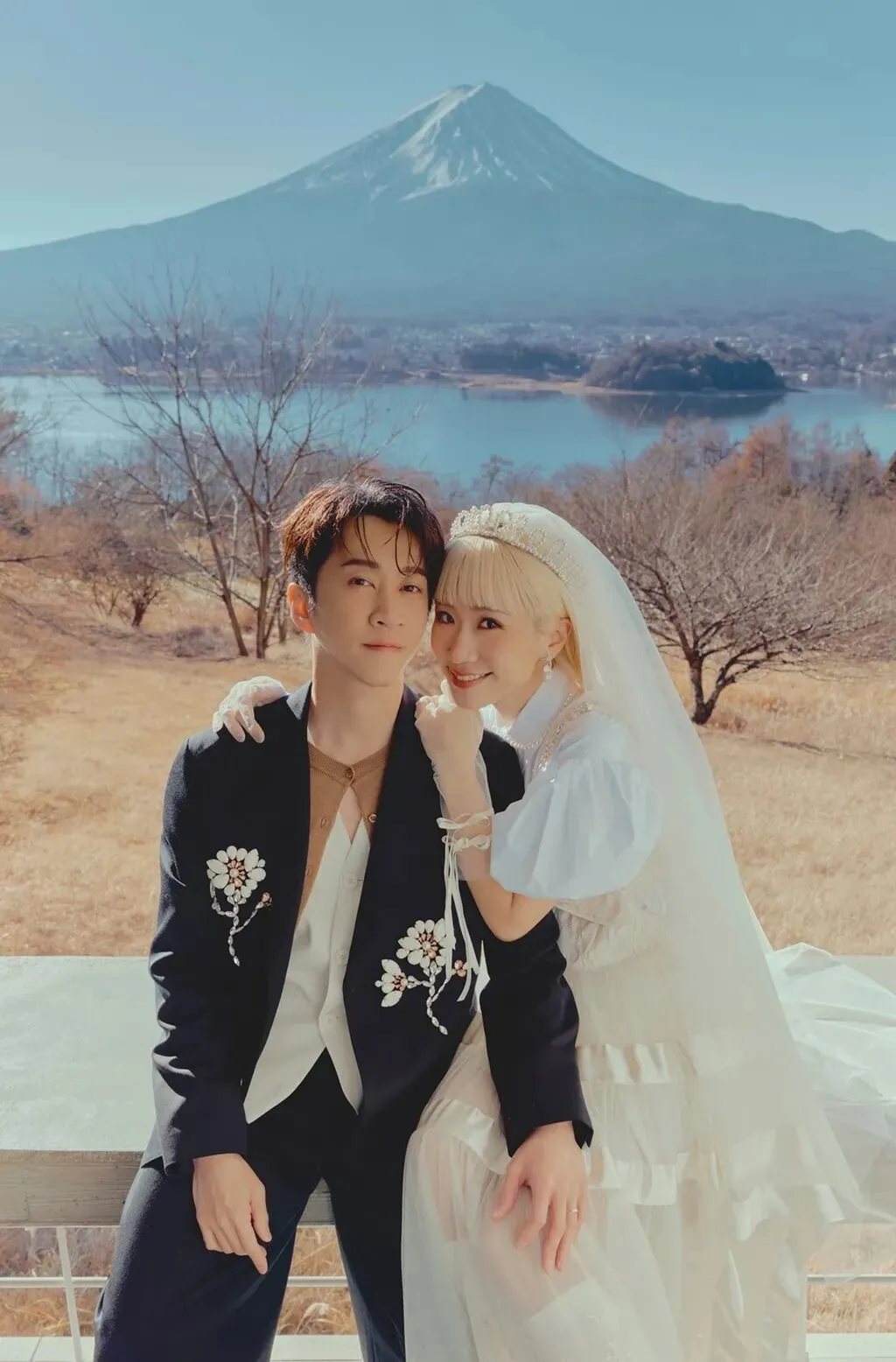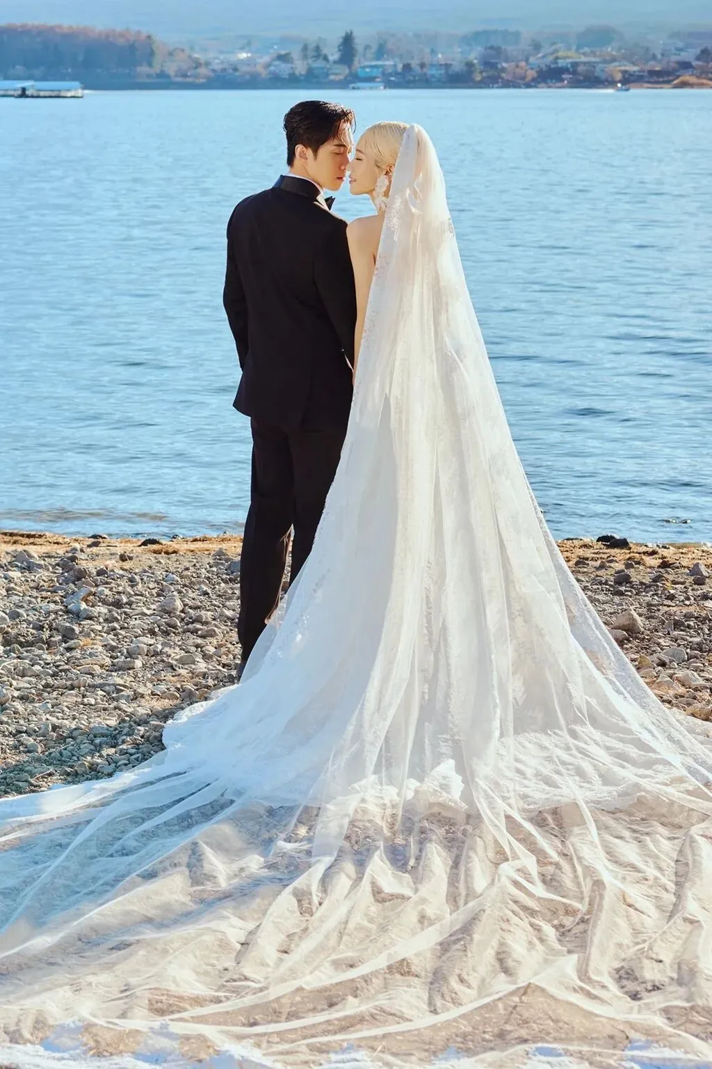 2人公布一系列富士山河口湖婚纱照,Lulu身穿Demetrios Bridal Room旗下品牌婚纱,头戴长头纱、身穿低胸唯美纯白礼服宛若“湖中女神”,