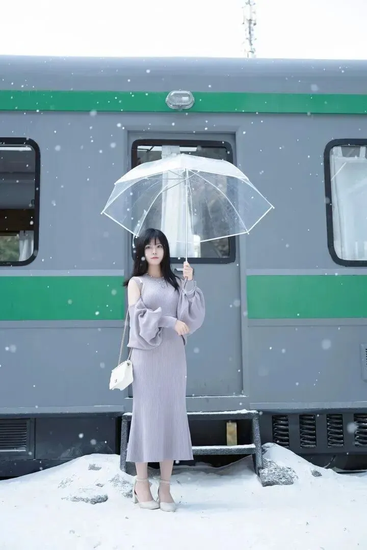 .车站也是.个出片的好.地方。.灰绿色的.火车和浅.色连衣裙.形成有趣的.对比,.她撑.着伞站.在雪地.里,像是在.等待一场美.好的旅程。