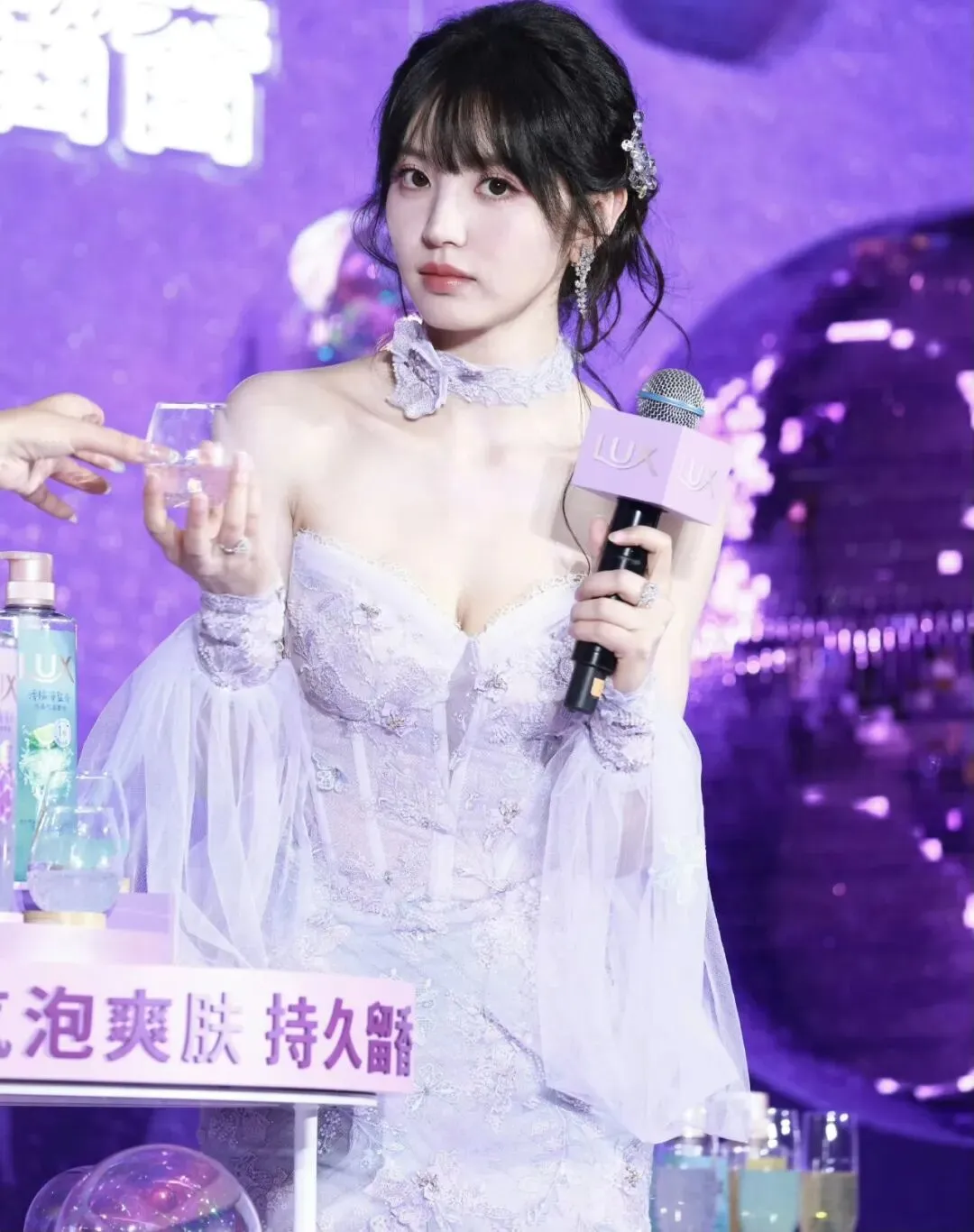 当田曦薇身着一袭紫色抹胸裙出现在线下活动现场时,她仿佛并非从幕后走来,而是携着一缕来自春日花园的晨雾与霞光,悄然降临人间。整个空间因她的出现而瞬间明亮、柔和,她以其独有的甜美气质与精心雕琢的造型,完美诠释了何为“仙女下凡”,用最直观的视觉语言,为“青春”与“美”做出了最动人的代言。