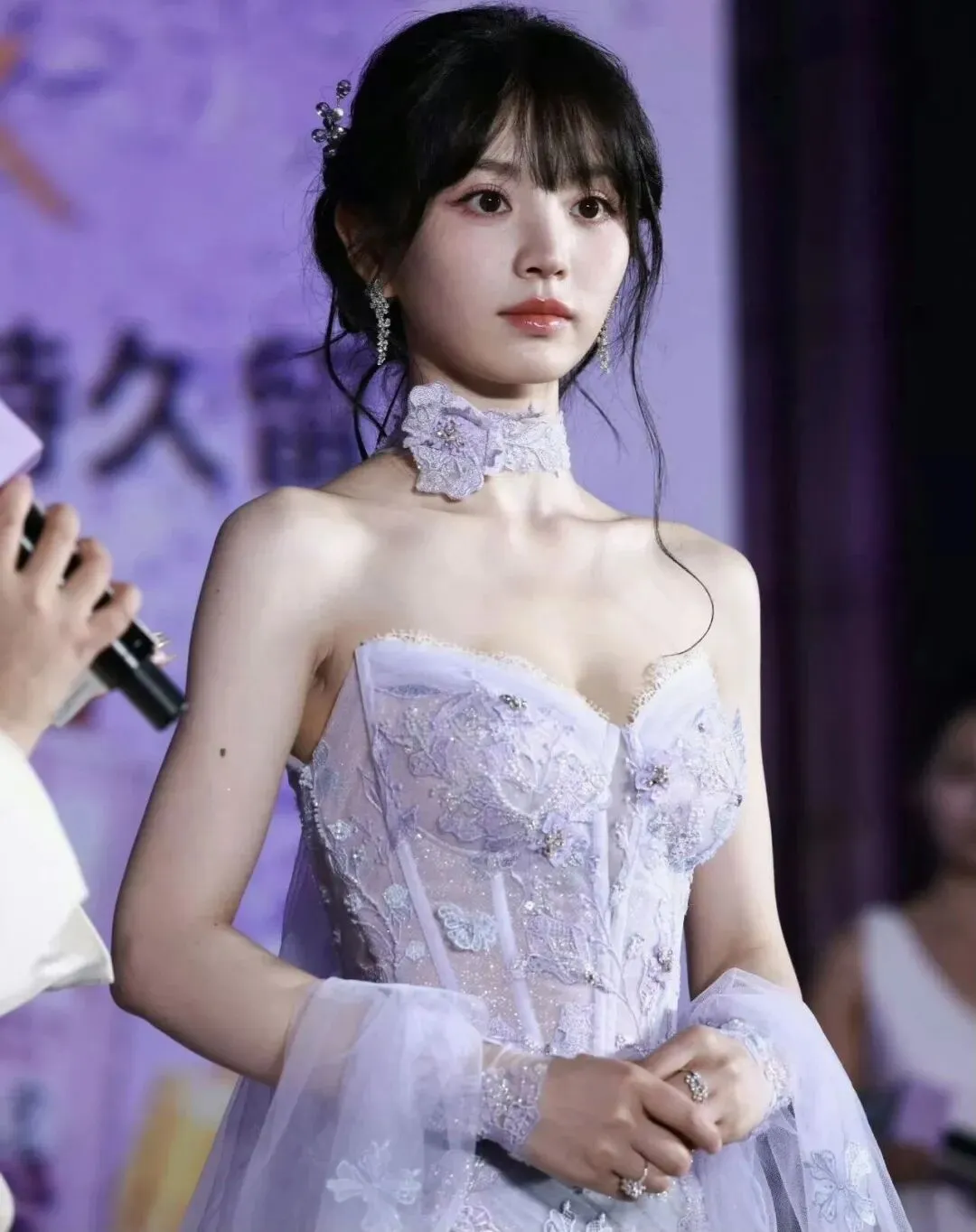 紫色,是这场视觉盛宴的灵魂。它并非浓重的深紫,而是一种清浅、柔和的色调,如同薰衣草花田在黎明时分氤氲出的薄雾,既保留了紫色的浪漫与神秘,又注入了无限的轻盈与梦幻。这个颜色的选择,与她甜美无邪的面容相得益彰,奠定了整体 “仙女”风格的基调。