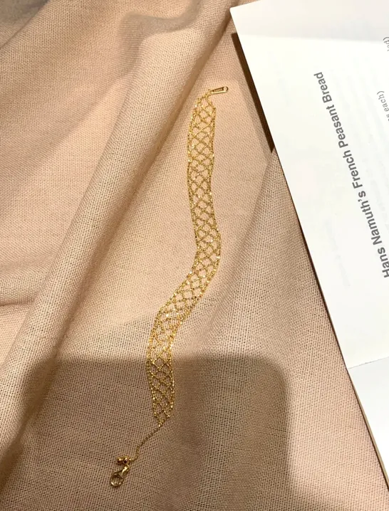说回手链本身,这条蕾丝瀑布手链材质是925银镀18K金,颜色是那种很温柔的哑光金,低调不俗气,完全不挑肤色。手链宽度大概1.1cm,长度17cm+3cm延长链,调节空间很大,手腕细的姐妹也能戴得刚刚好,手腕稍粗也不会勒。整个手链的工艺超级细腻,网格状的蕾丝编织感,细看会发现每一格都闪着柔和的光泽,像小瀑布一样垂在手腕上,轻盈又有层次感。重量只有2.8g,真的戴上一点都没负担,基本属于“戴了一整天都忘了它的存在”系列。价格的话,我是398元入的,性价比真的很能打,随便一个小众设计师品牌都要贵好多!