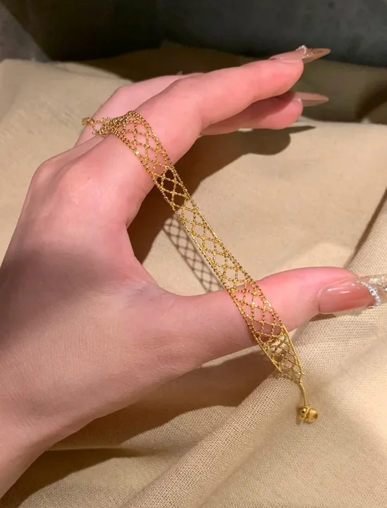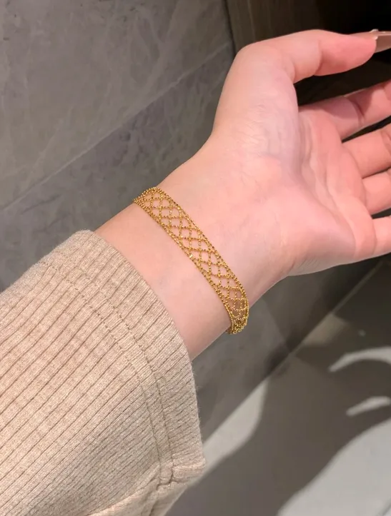 说到穿搭和叠戴,我真的很想安利给所有喜欢温柔、氛围感路线的姐妹。配米色、杏色、灰色系毛衣,手链的金色会和衣服色调呼应,一下就给整个look加了点睛之笔。上班族可以搭配白衬衫或者卡其色针织,手腕一抬就是那种“很会生活”的精致感。约会、聚会或者节日场合,配蕾丝上衣、细带连衣裙也完全没压力,甚至可以和小珍珠手链、素金手链一起叠戴,氛围感直接max。身边有同事问我:“这种网格手链会不会容易勾毛衣?”我亲测,这条真的很顺滑,基本不挂线,偶尔碰到毛线球也没出现拉丝,工艺真的赞!