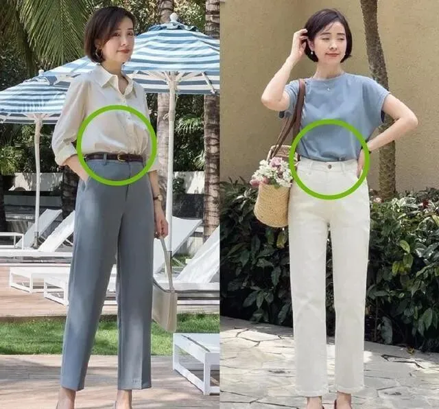 或者用深色上衣 , 颜色本身就显瘦 , 衣摆再够到臀部位置 , 双重遮挡。