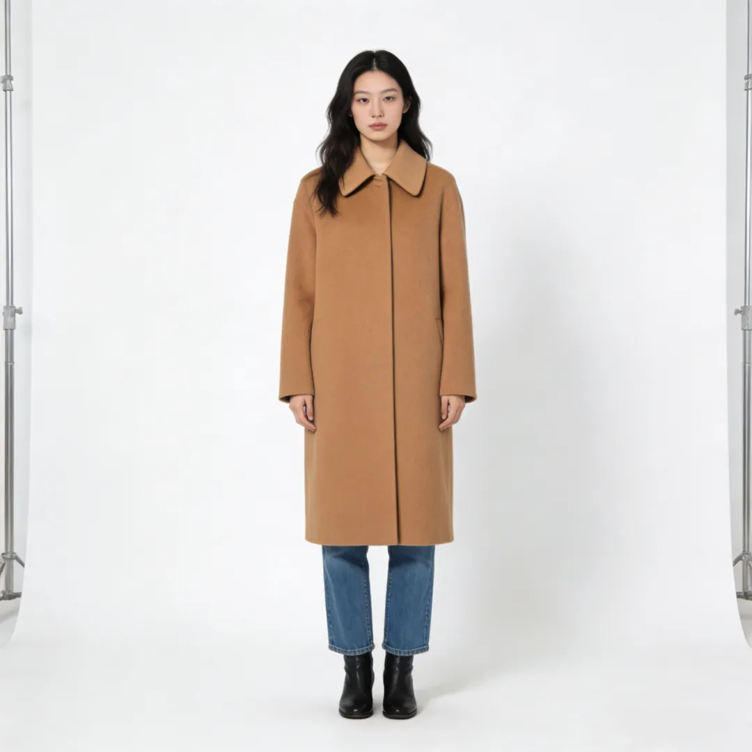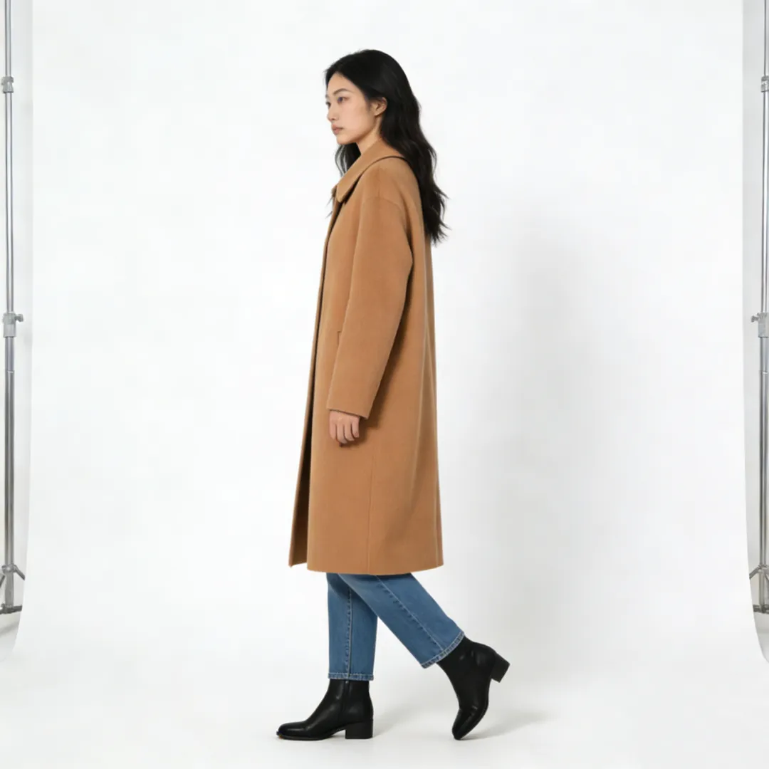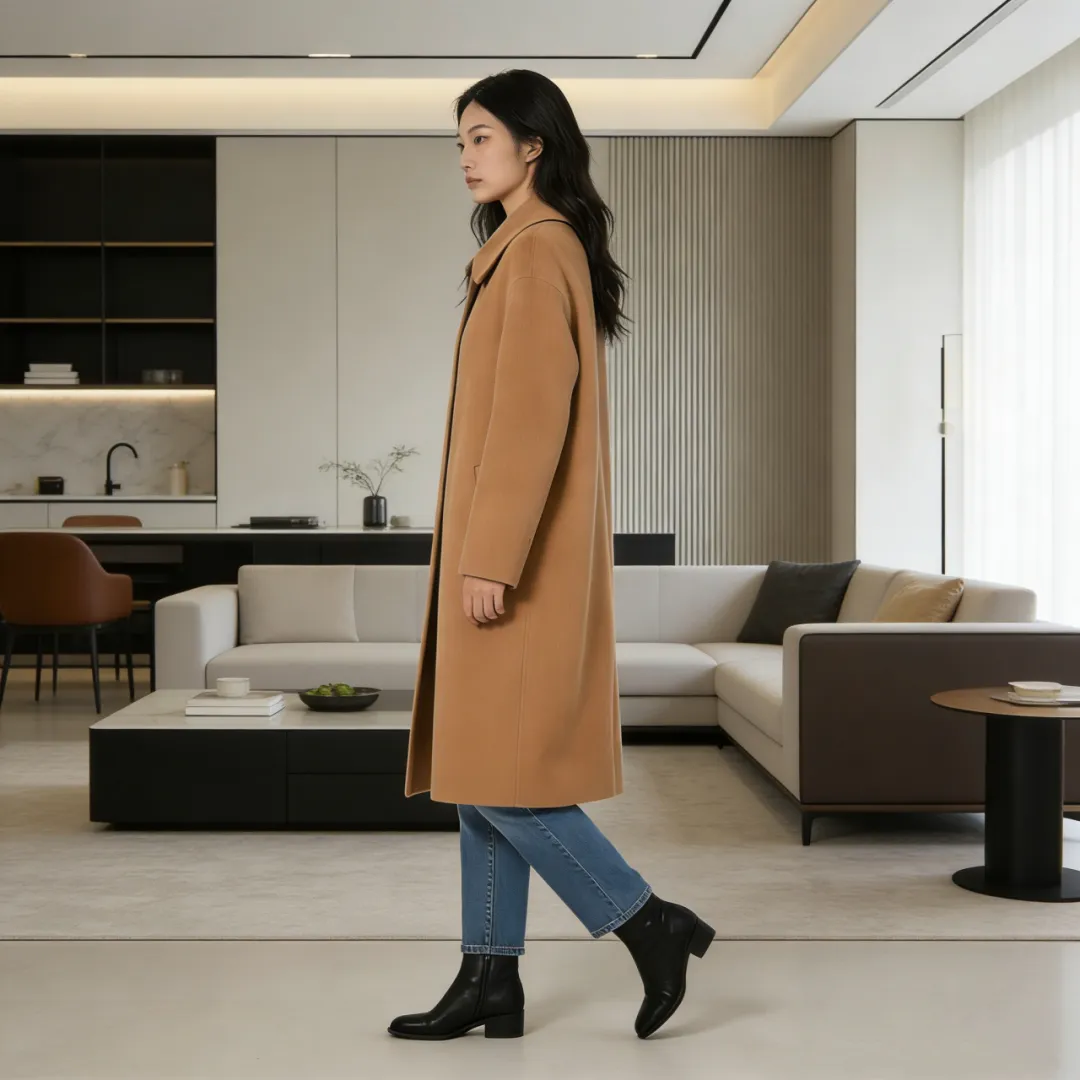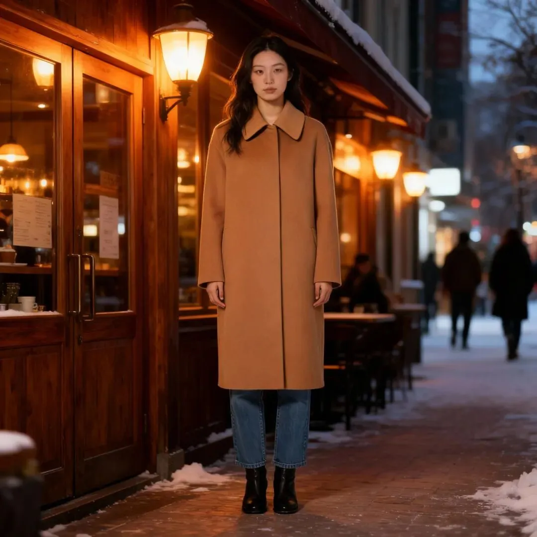 ✔【生成效果】:系统根据指令精准生成对应场景,自动将穿棕色大衣的模特融入其中,背景中零星行人增添生活气息,整体画面毫无违和感。