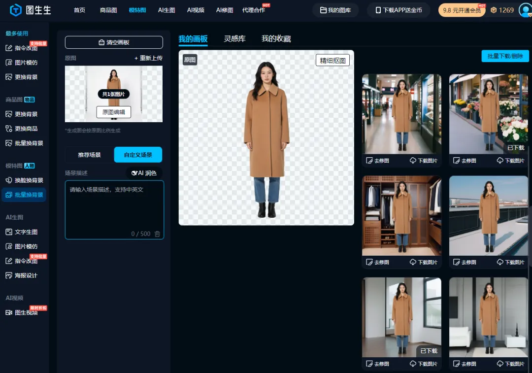 直到用了图生生模特换背景功能才解放双手!以女装模特原图为例,不用额外拍图,一键切换场景,轻松搞定电商带货高质量配图。